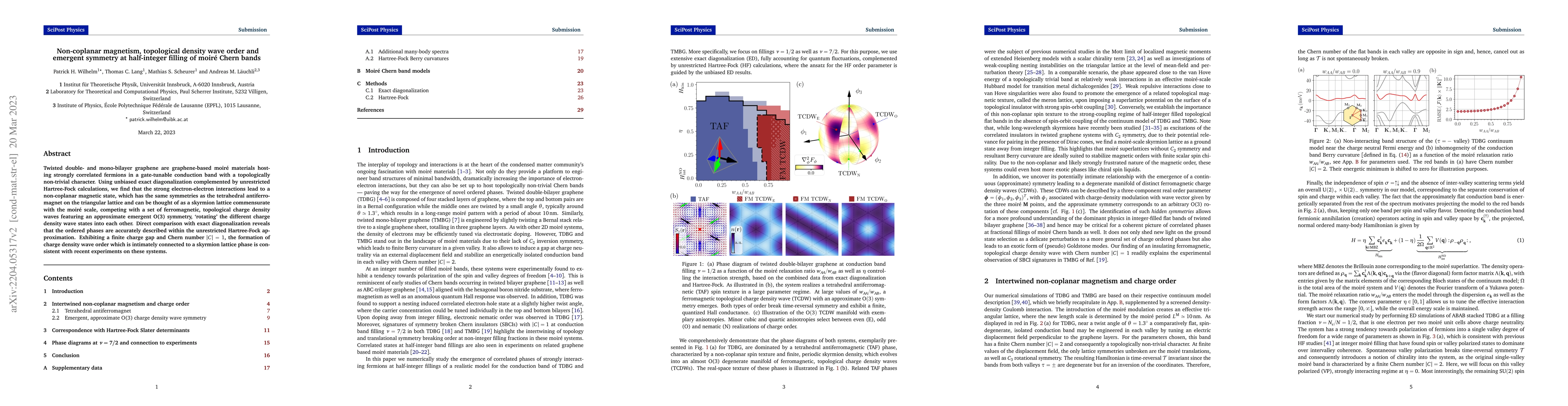 This paper investigates strongly correlated fermions in twisted bilayer graphene, revealing a non-coplanar magnetic state and topological charge density waves with emergent symmetry at half-integer filling. The findings are consistent with recent experimental observations and accurately described by the unrestricted Hartree-Fock approximation.
