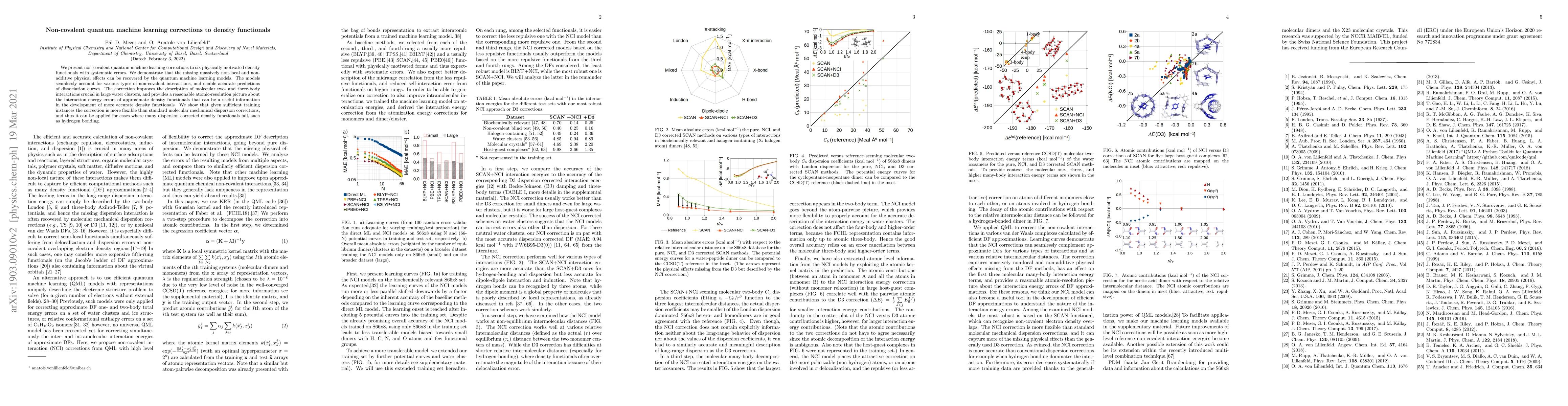 We present noncovalent quantum machine learning corrections to six physically motivated density functionals with systematic errors. We demonstrate that the missing massively nonlocal and nonadditive physical effects can be recovered by quantum machine learning models. The models seamlessly account for various types of noncovalent interactions and enable accurate predictions of dissociation curves. The correction improves the description of molecular two- and three-body interactions crucial in large water clusters and provides a reasonable atomic-resolution picture about the interaction energy errors of approximate density functionals that can be useful information in the development of more accurate density functionals. We show that given sufficient training instances the correction is more flexible than standard molecular mechanical dispersion corrections, and thus it can be applied for cases where many dispersion corrected density functionals fail, such as hydrogen bonding.