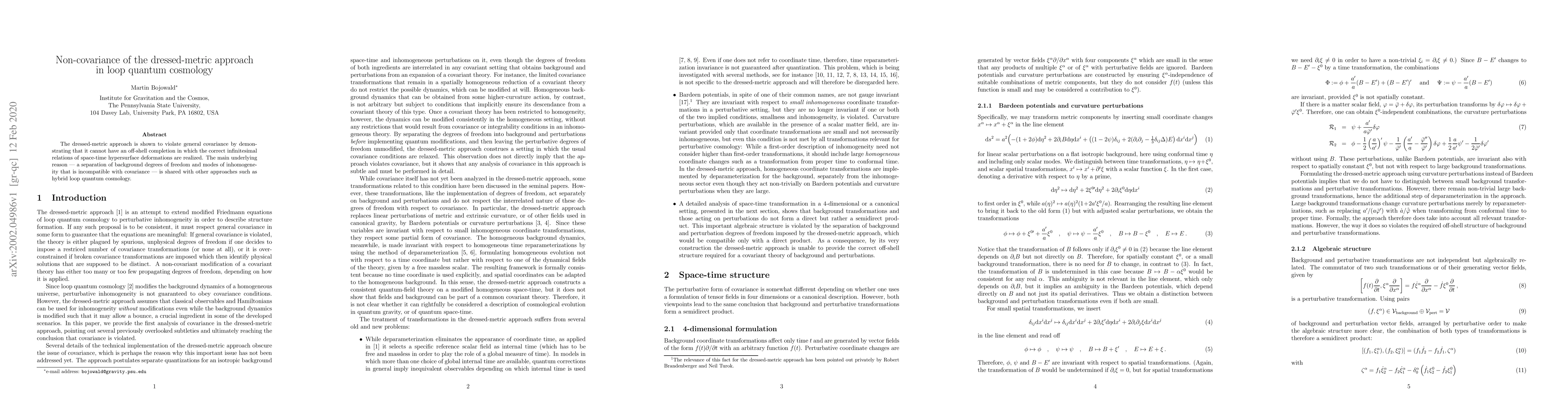 The dressed-metric approach is shown to violate general covariance by demonstrating that it cannot have an off-shell completion in which the correct infinitesimal relations of space-time hypersurface deformations are realized. The main underlying reason -- a separation of background degrees of freedom and modes of inhomogeneity that is incompatible with covariance -- is shared with other approaches such as hybrid loop quantum cosmology.