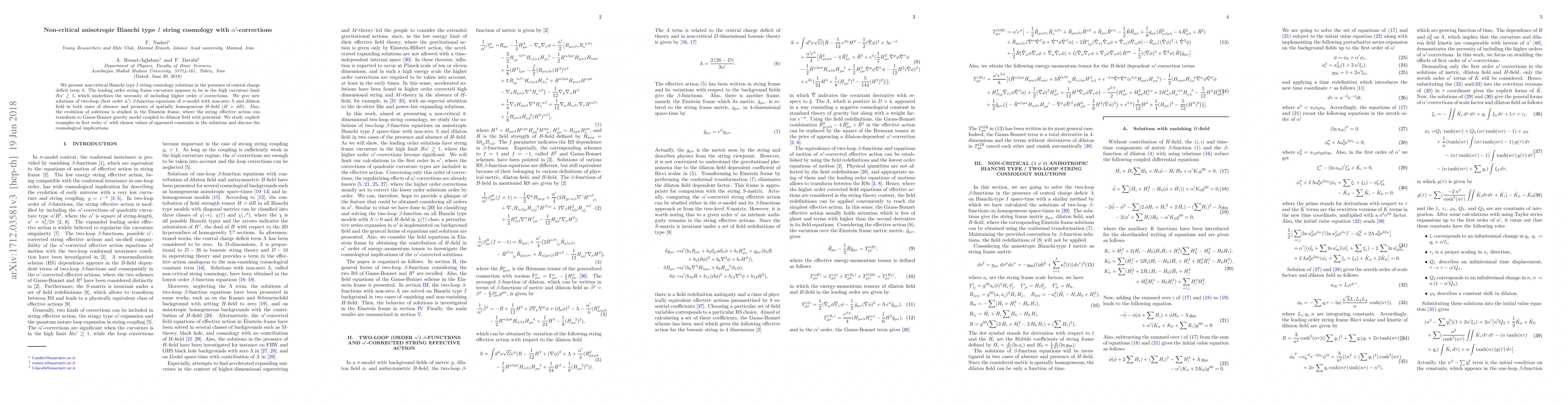 We present non-critical Bianchi type $I$ string cosmology solutions in the presence of central charge deficit term $\Lambda$. The leading order string frame curvature appears to be in the high curvature limit $R\alpha'\gtrsim1$, which underlines the necessity of including higher order $\alpha'$-corrections. We give new solutions of two-loop (order $\alpha'$) $\beta$-function equations of $\sigma$-model with non-zero $\Lambda$ and dilaton field in both cases of absence and presence of spatially homogeneous $H$-field ($H=dB$). Also, the evolution of solutions is studied in the Einstein frame, where the string effective action can transform to Gauss-Bonnet gravity model coupled to the dilaton field with potential. We study explicit examples in order $\alpha'$ with chosen values of appeared constants in the solutions and discuss the cosmological implications.