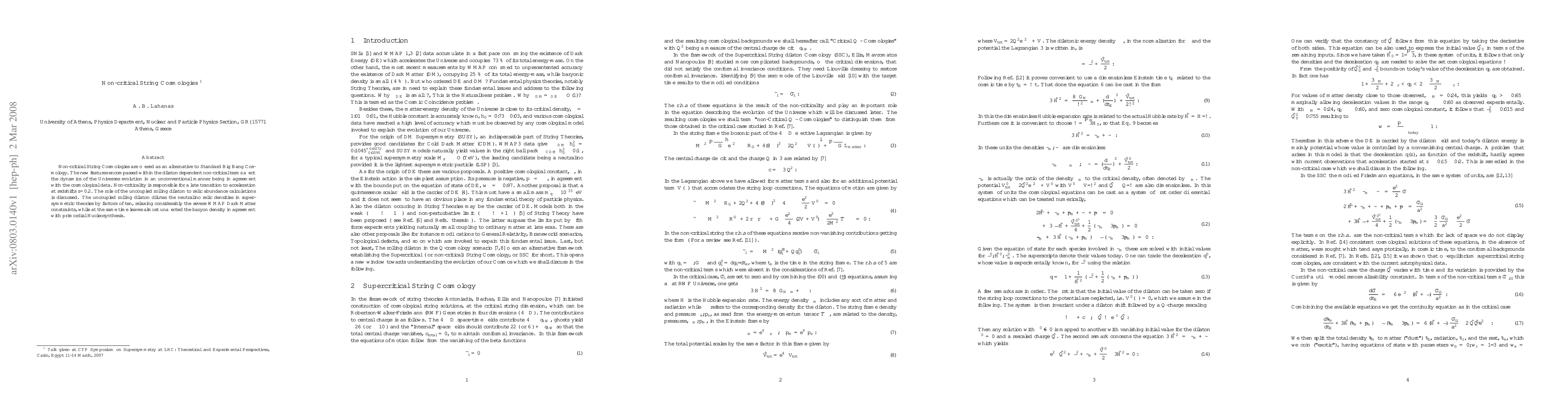 This paper proposes non-critical string cosmologies as an alternative to Standard Big Bang Cosmology, showing unconventional dynamics due to dilaton-dependent terms. The model allows for a late transition to acceleration at redshifts z=0.2, and an uncoupled rolling dilaton significantly reduces neutralino relic densities, easing dark matter constraints without affecting baryon density.