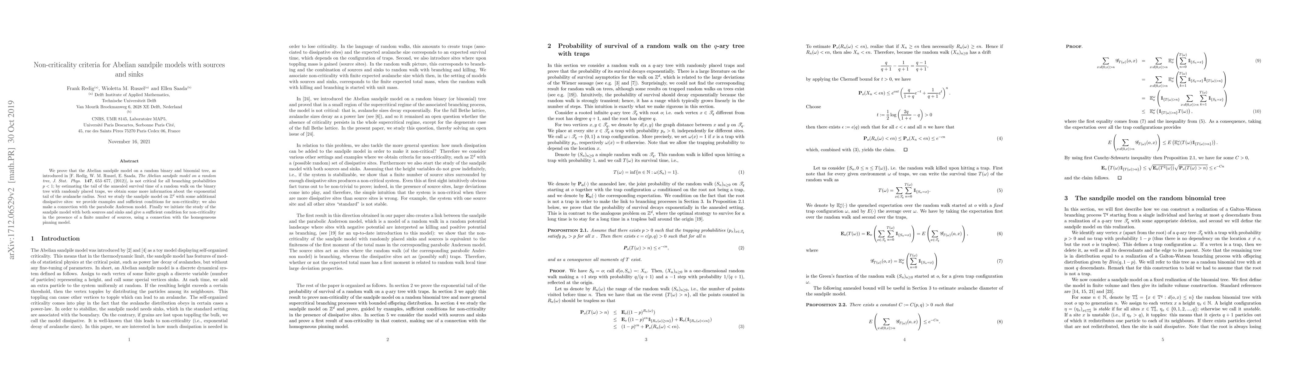 This paper proves non-criticality in Abelian sandpile models on random binary and binomial trees for branching probabilities less than 1, using random walk survival time estimates. It also explores sandpile models on $\mathbb{Z}^d$ with dissipative sites and establishes a connection with the parabolic Anderson model, concluding with a sufficient condition for non-criticality in models with both sources and sinks.
