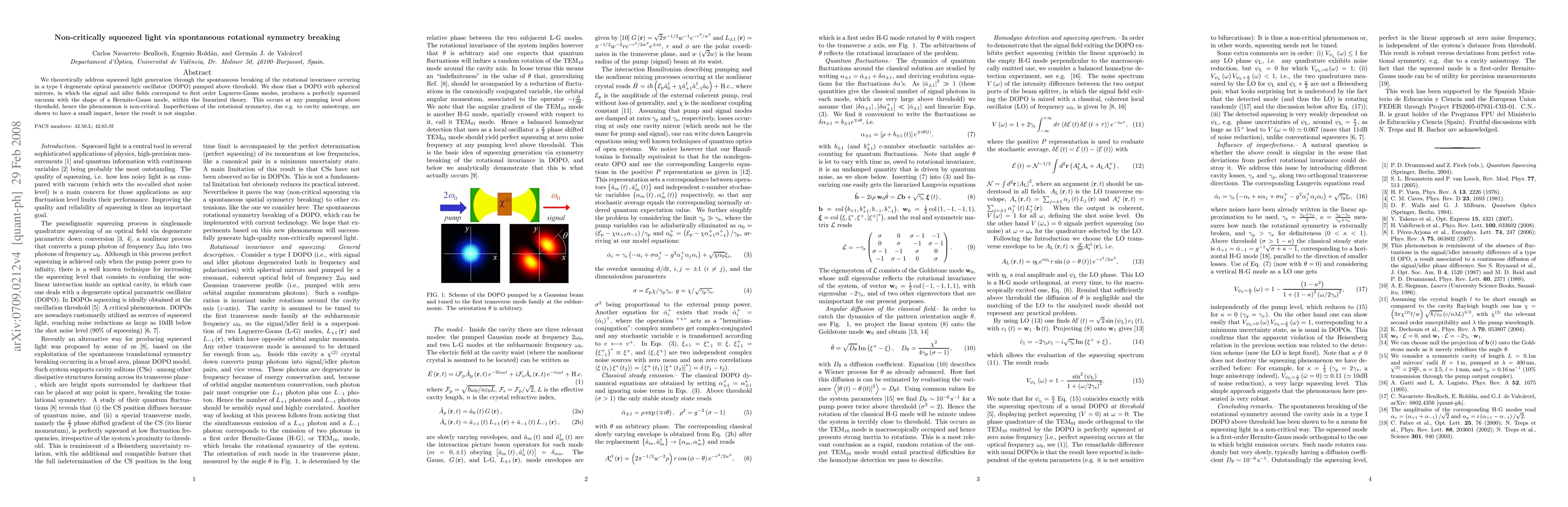 We theoretically address squeezed light generation through the spontaneous breaking of the rotational invariance occuring in a type I degenerate optical parametric oscillator (DOPO) pumped above threshold. We show that a DOPO with spherical mirrors, in which the signal and idler fields correspond to first order Laguerre-Gauss modes, produces a perfectly squeezed vacuum with the shape of a Hermite-Gauss mode, within the linearized theory. This occurs at any pumping level above threshold, hence the phenomenon is non-critical. Imperfections of the rotational symmetry, due e.g. to cavity anisotropy, are shown to have a small impact, hence the result is not singular.