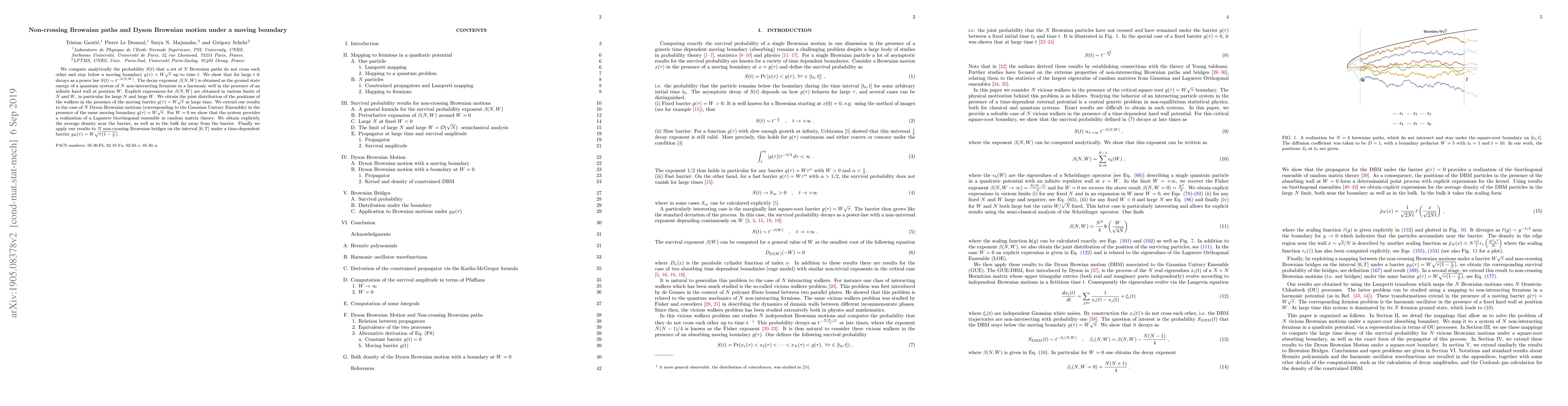 This paper analytically computes the probability that $N$ Brownian paths remain non-crossing and below a moving boundary, showing a power law decay for large times. The decay exponent is linked to the ground state energy of a quantum system of fermions with a hard wall, providing explicit expressions for large $N$ and $W$.