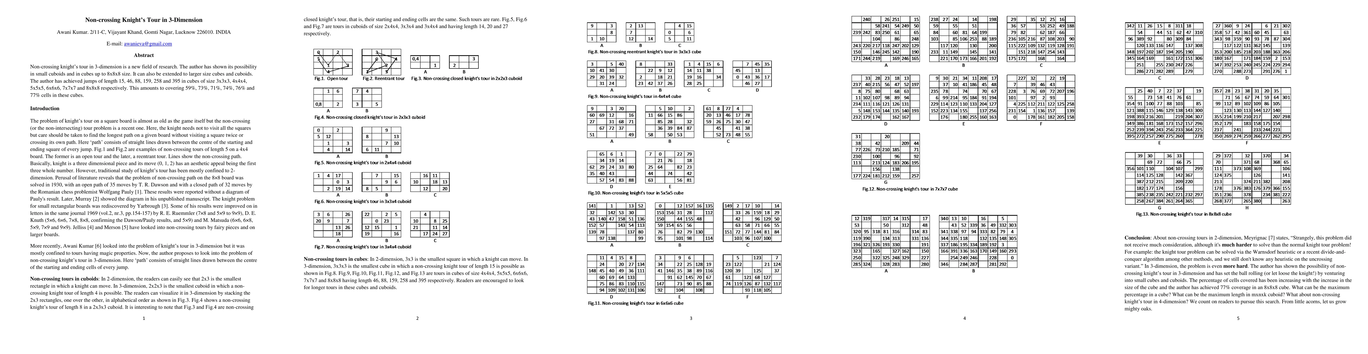 Researchers have successfully implemented non-crossing knight's tours in 3D cubes up to 8x8x8 size, covering between 59% and 77% of cells with jumps of varying lengths.