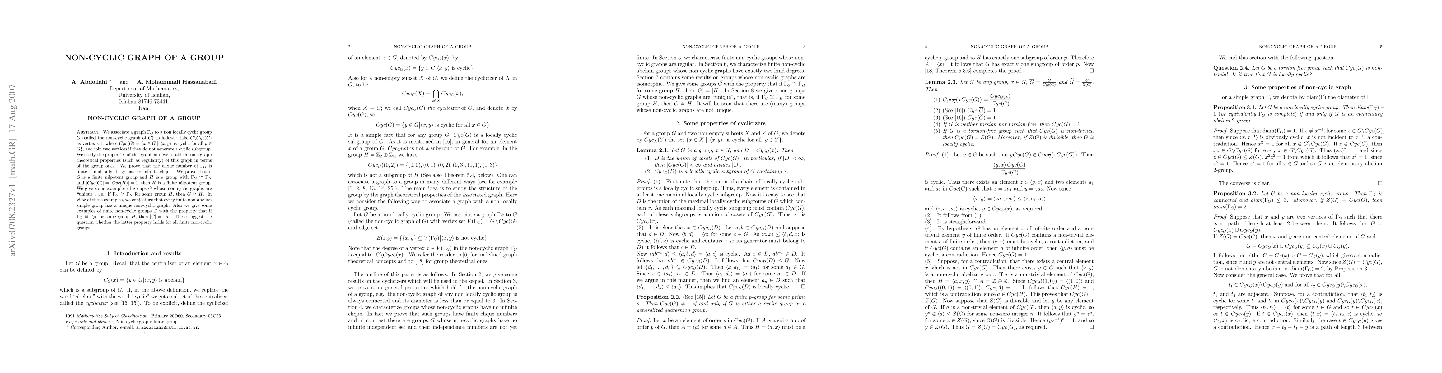 This paper associates a non-cyclic graph $\Gamma_G$ to a non locally cyclic group $G$, where vertices represent non-cyclic subgroups and edges connect vertices that do not generate cyclic subgroups. The study reveals regularity and finite clique number properties linked to group structure, and proposes a conjecture about the uniqueness of non-cyclic graphs for finite non-abelian simple groups.