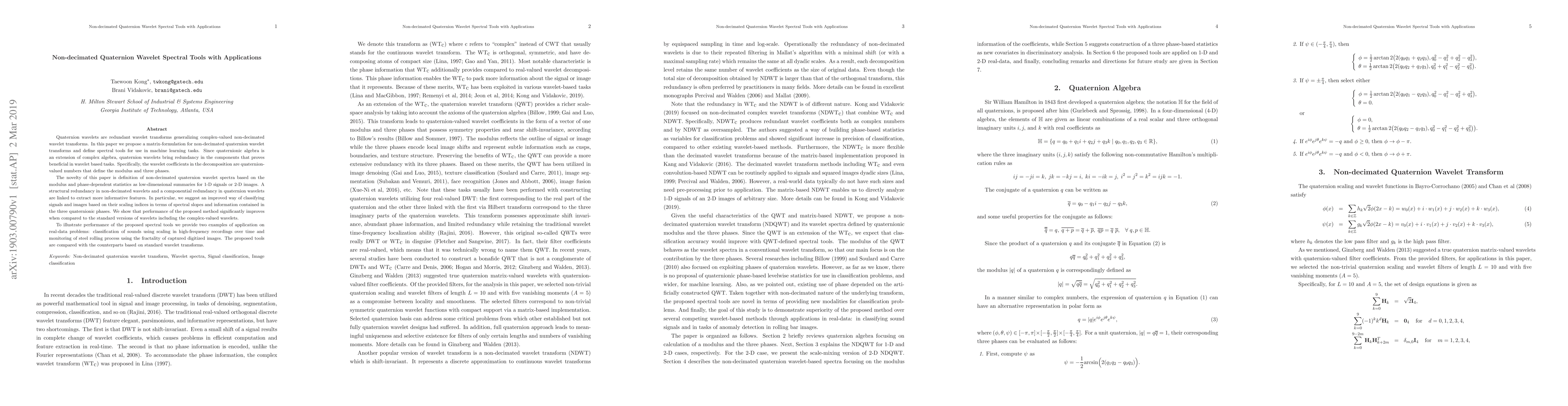 The paper presents a novel matrix-formulation for non-decimated quaternion wavelet transforms and defines spectral tools for machine learning tasks, utilizing the structural and componential redundancies inherent in quaternion wavelets.