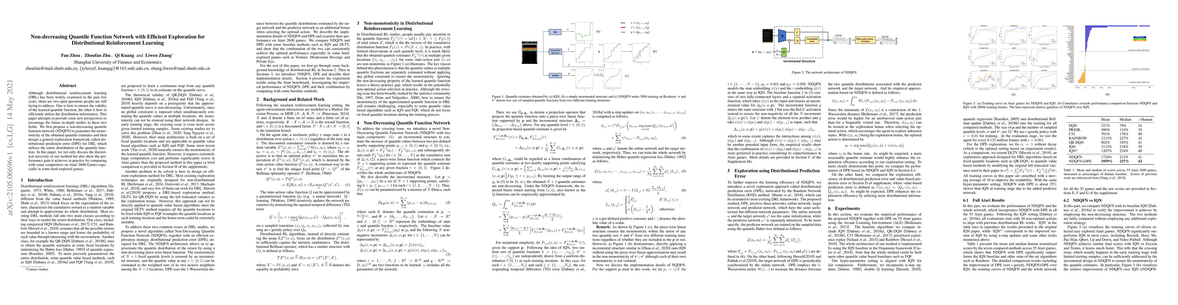 This paper proposes a non-decreasing quantile function network (NDQFN) to maintain monotonicity in quantile estimates and introduces a distributional prediction error (DPE) framework for efficient exploration in distributional reinforcement learning. The method demonstrates improved performance in hard-explored Atari 2600 games compared to competitors.