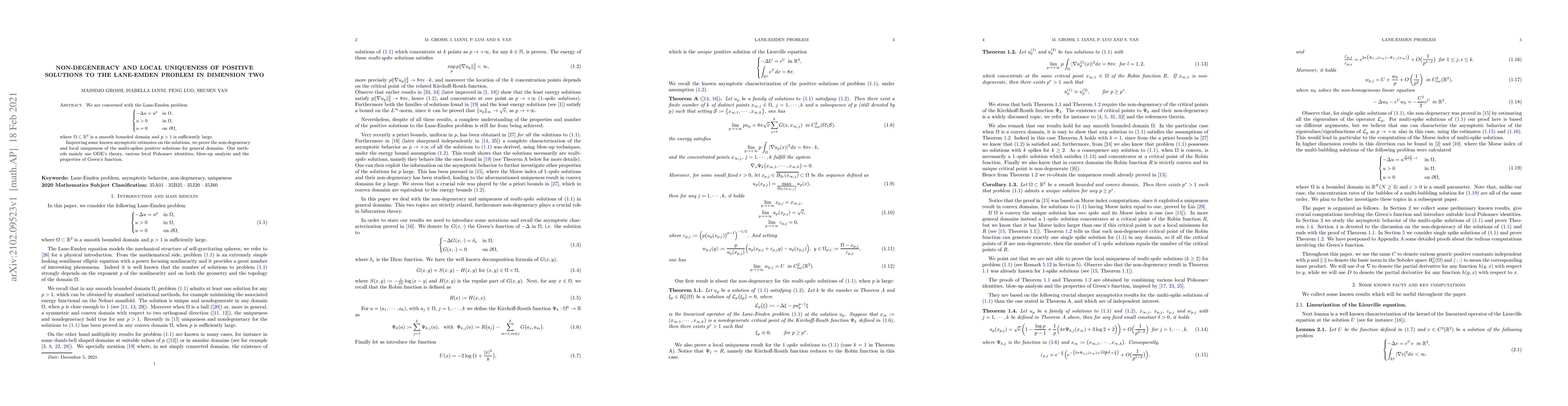 This paper investigates the Lane-Emden problem in two dimensions, proving non-degeneracy and local uniqueness of multi-spikes positive solutions. The authors utilize ODE theory, local Pohozaev identities, blow-up analysis, and properties of Green's function to achieve these results.