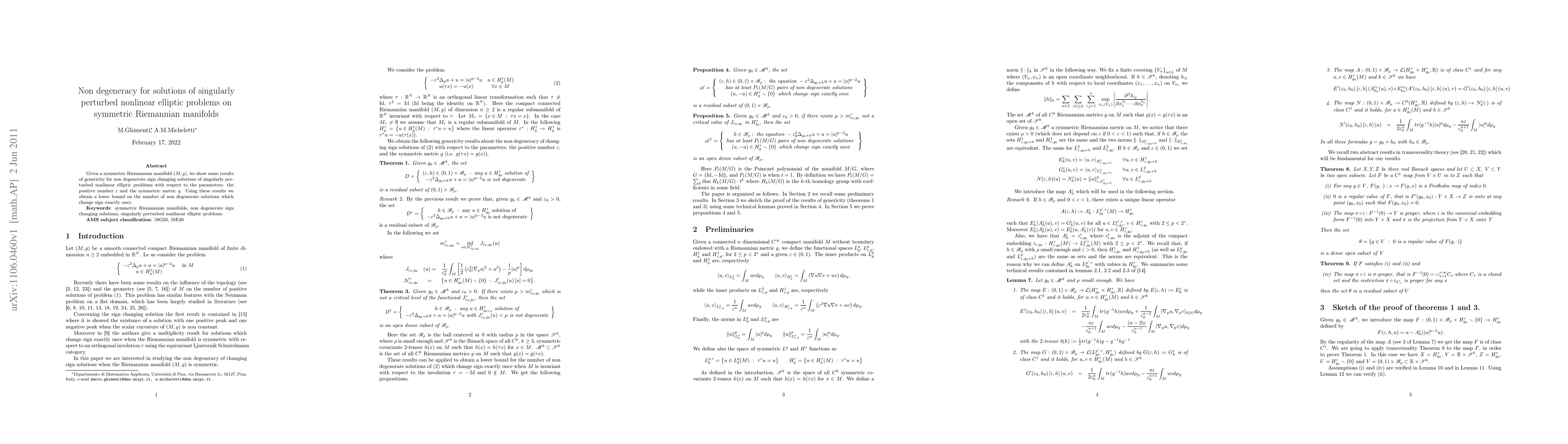 Given a symmetric Riemannian manifold (M, g), we show some results of genericity for non degenerate sign changing solutions of singularly perturbed nonlinear elliptic problems with respect to the parameters: the positive number {\epsilon} and the symmetric metric g. Using these results we obtain a lower bound on the number of non degenerate solutions which change sign exactly once.