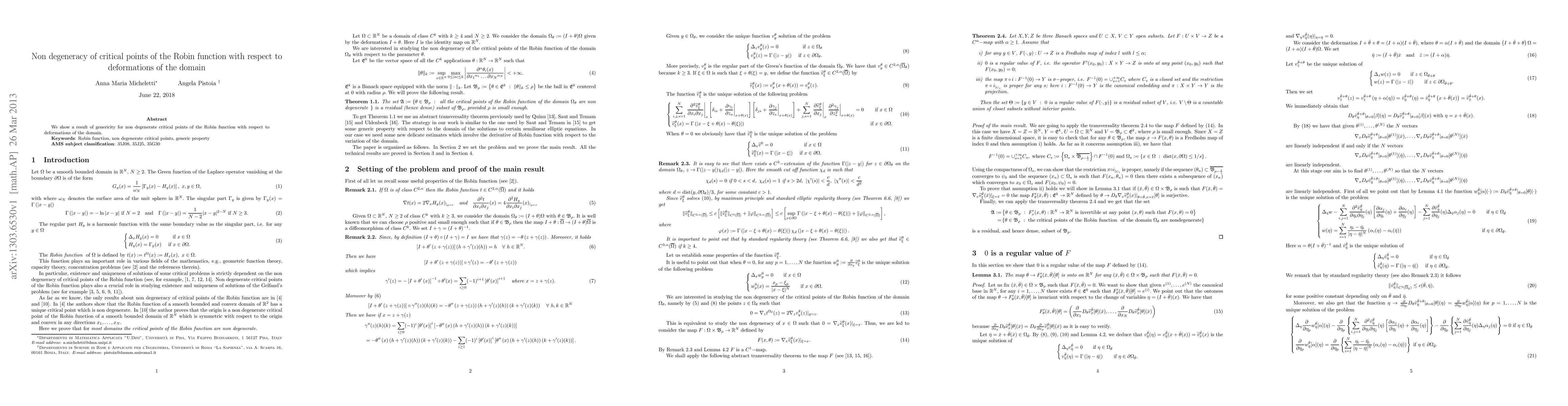 Summary: This paper demonstrates that non-degenerate critical points of the Robin function are generically stable under domain deformations. The result highlights the robustness of these critical points in geometric analysis.