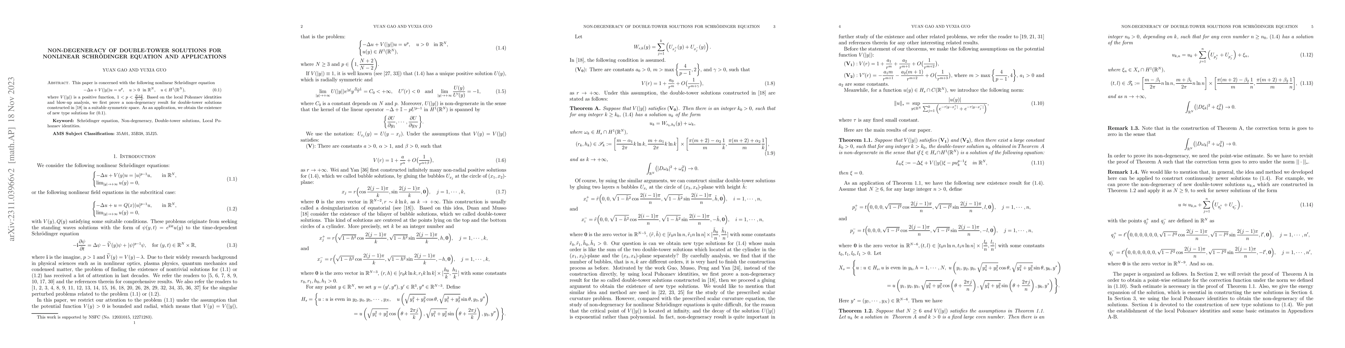 This paper proves the non-degeneracy of double-tower solutions for a nonlinear Schrödinger equation using local Pohozaev identities and blow-up analysis, and applies this result to establish the existence of new type solutions in a suitable symmetric space.