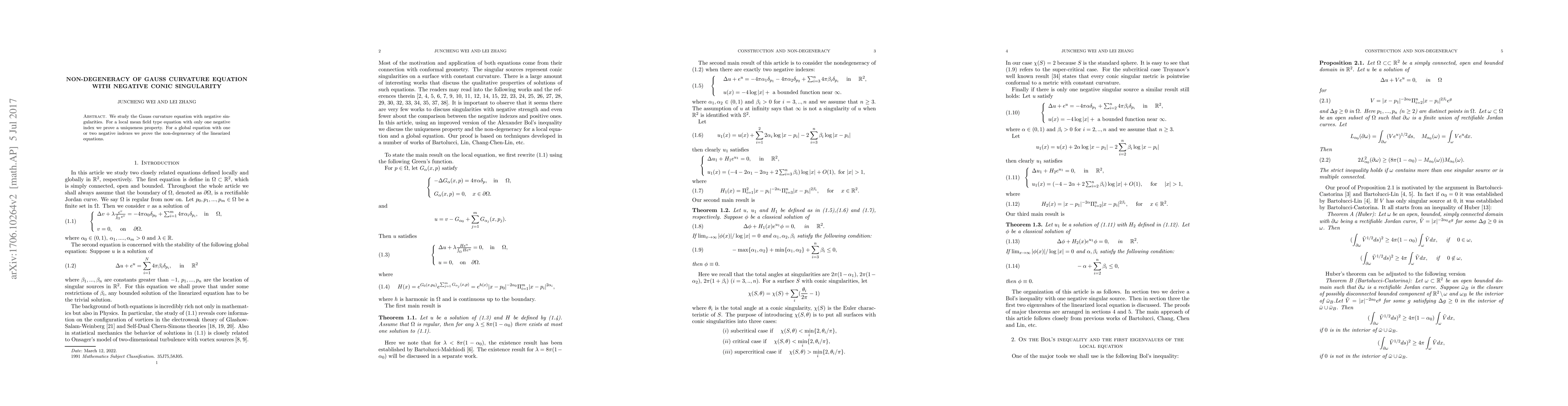 We study the Gauss curvature equation with negative singularities. For a local mean field type equation with only one negative index we prove a uniqueness property. For a global equation with one or two negative indexes we prove the non-degeneracy of the linearized equations.