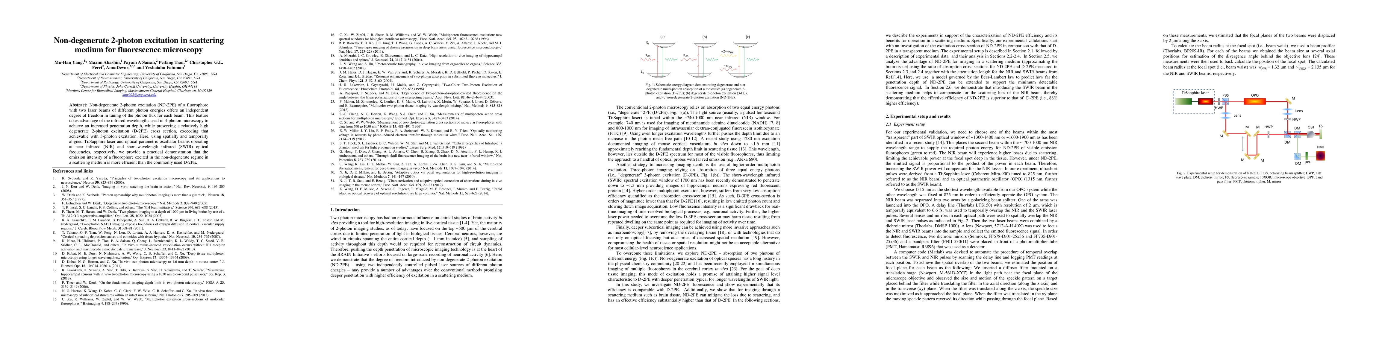 This paper demonstrates that non-degenerate 2-photon excitation (ND-2PE) using different laser beams at near and short-wavelength infrared frequencies is more efficient for fluorescence microscopy in scattering media compared to traditional degenerate 2-photon excitation (D-2PE). The ND-2PE method enhances penetration depth while maintaining a high excitation cross-section.