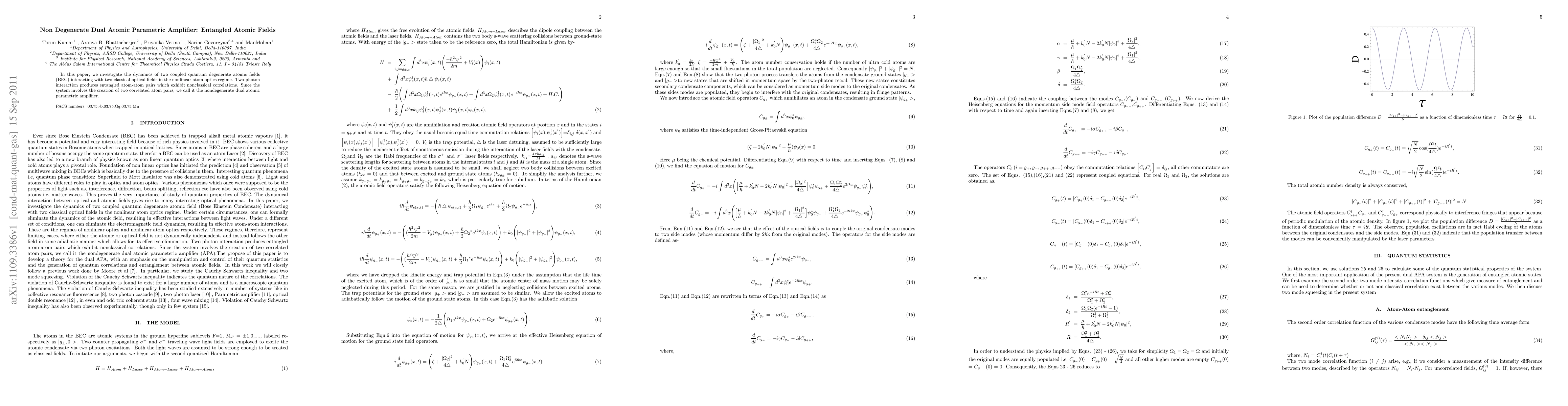 This paper explores the dynamics of two coupled degenerate atomic fields interacting with classical optical fields, resulting in the creation of entangled atom-atom pairs via two-photon interactions. The system is termed a nondegenerate dual atomic parametric amplifier due to the generation of correlated atom pairs.