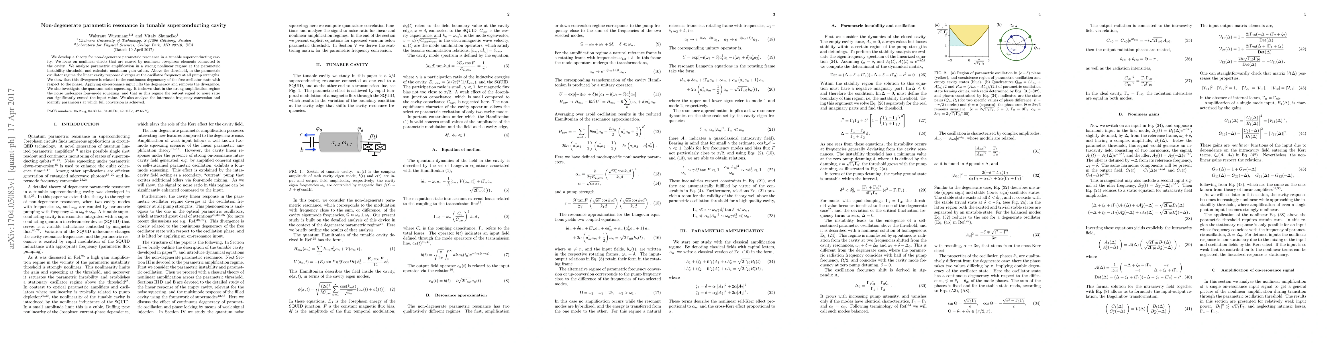 This paper develops a theory for non-degenerate parametric resonance in a tunable superconducting cavity, focusing on nonlinear effects from Josephson elements. It analyzes parametric amplification and shows that above the instability threshold, the linear cavity response diverges due to phase degeneracy, which can be lifted by on-resonance input. The study also investigates quantum noise squeezing and intermode frequency conversion, revealing significant signal-to-noise ratio improvements and conditions for full conversion.