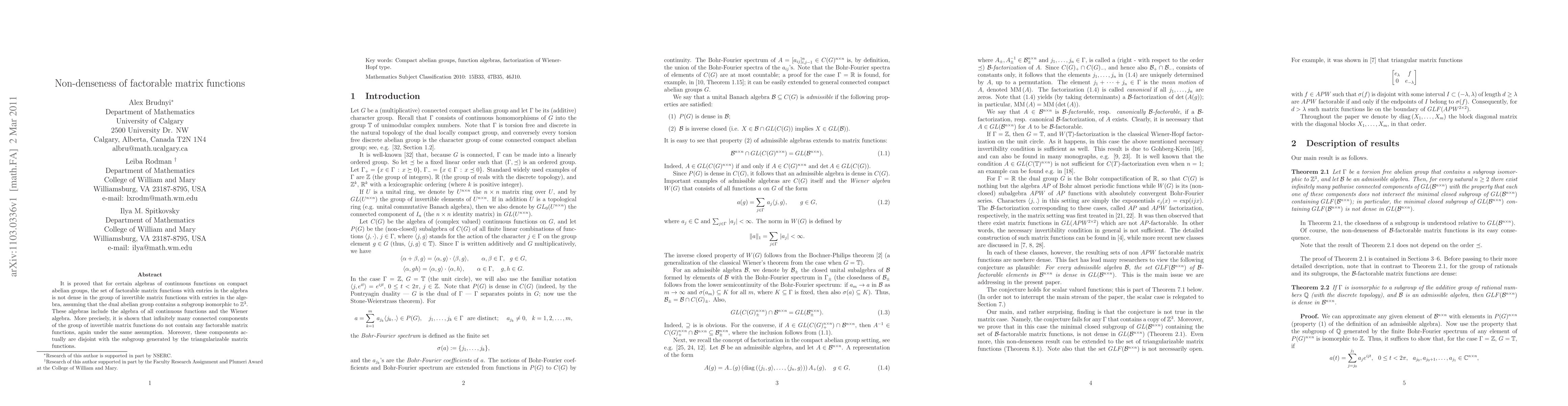 This paper proves the non-denseness of factorable matrix functions in the group of invertible matrix functions for certain algebras on compact abelian groups, particularly when the dual group includes a subgroup isomorphic to Z^3. It highlights the existence of infinitely many disjoint connected components in the group of invertible matrix functions that do not contain any factorable matrix functions.