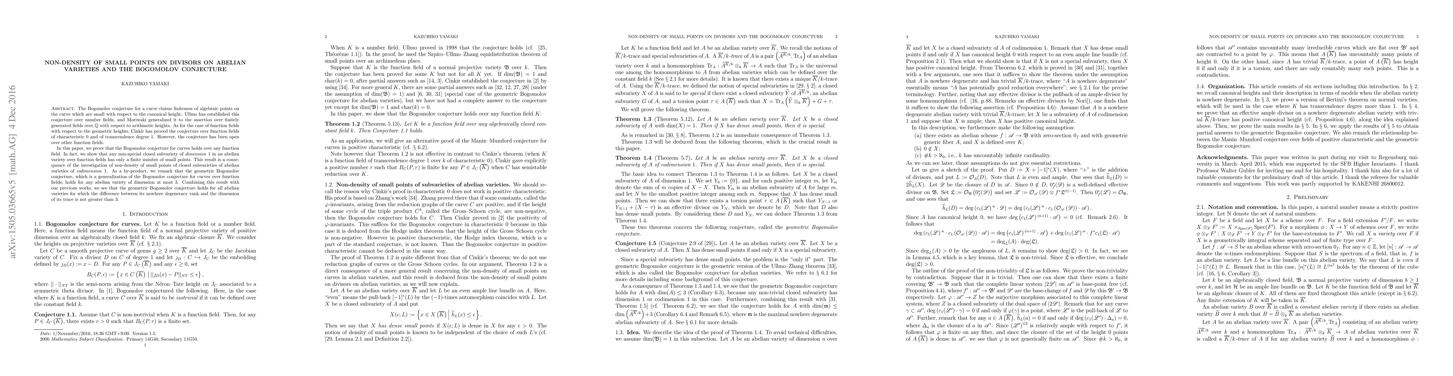This paper proves the Bogomolov conjecture for curves over any function field, confirming the finiteness of small points on divisors. Additionally, it establishes the geometric Bogomolov conjecture for abelian varieties of dimension up to $3$, extending previous results and broadening the scope of the conjecture.