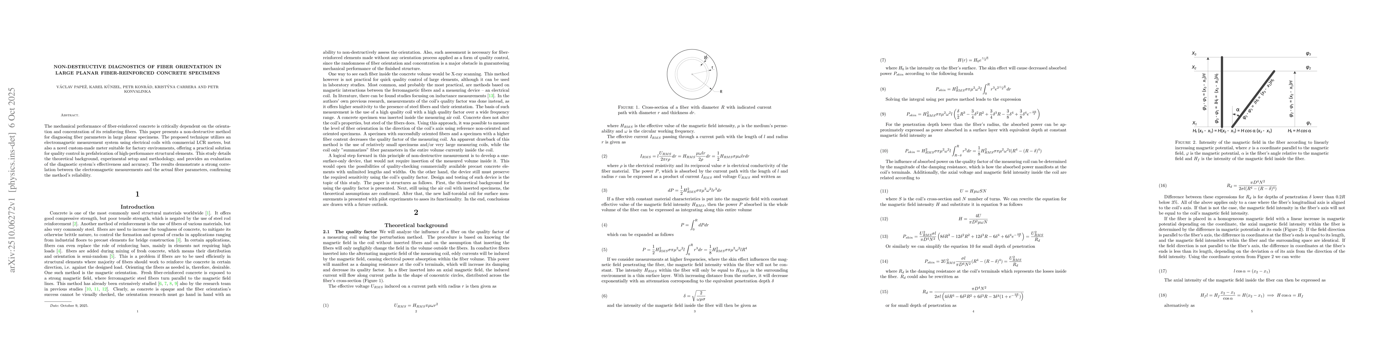 The mechanical performance of fiber-reinforced concrete is critically dependent on the orientation and concentration of its reinforcing fibers. This paper presents a non-destructive method for diagnosing fiber parameters in large planar specimens. The proposed technique utilizes an electromagnetic measurement system using electrical coils with commercial LCR meters, but also a novel custom-made meter suitable for factory environments, offering a practical solution for quality control in prefabrication of high-performance structural elements. This study details the theoretical background, experimental setup and methodology, and provides an evaluation of the diagnostic system's effectiveness and accuracy. The results demonstrate a strong correlation between the electromagnetic measurements and the actual fiber parameters, confirming the method's reliability.