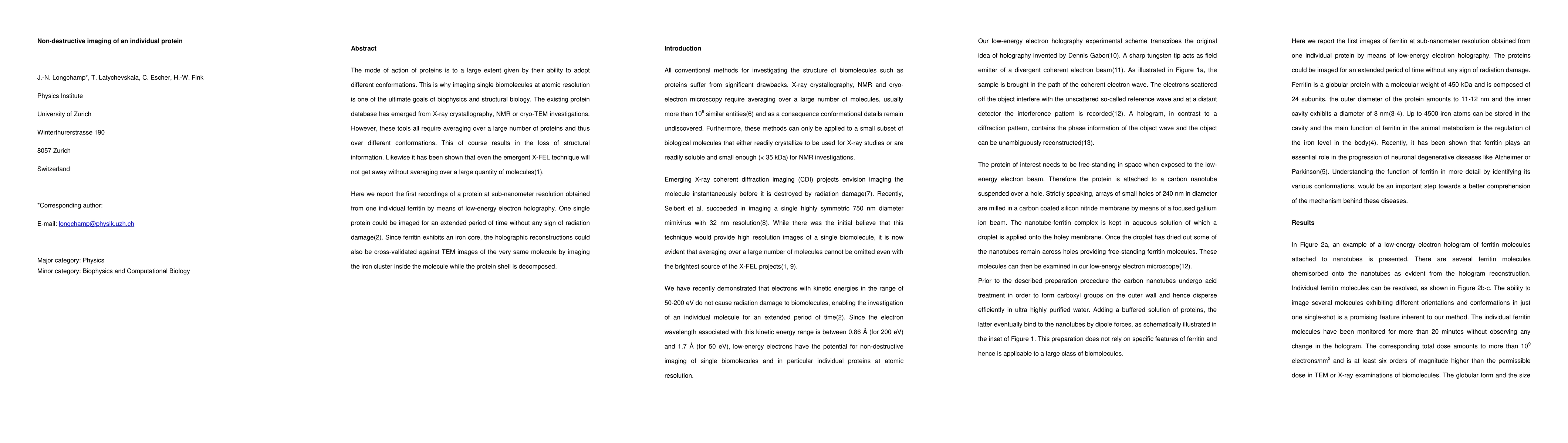 The mode of action of proteins is to a large extent given by their ability to adopt different conformations. This is why imaging single biomolecules at atomic resolution is one of the ultimate goals of biophysics and structural biology. The existing protein database has emerged from X-ray crystallography, NMR or cryo-TEM investigations. However, these tools all require averaging over a large number of proteins and thus over different conformations. This of course results in the loss of structural information. Likewise it has been shown that even the emergent X-FEL technique will not get away without averaging over a large quantity of molecules. Here we report the first recordings of a protein at sub-nanometer resolution obtained from one individual ferritin by means of low-energy electron holography. One single protein could be imaged for an extended period of time without any sign of radiation damage. Since ferritin exhibits an iron core, the holographic reconstructions could also be cross-validated against TEM images of the very same molecule by imaging the iron cluster inside the molecule while the protein shell is decomposed.