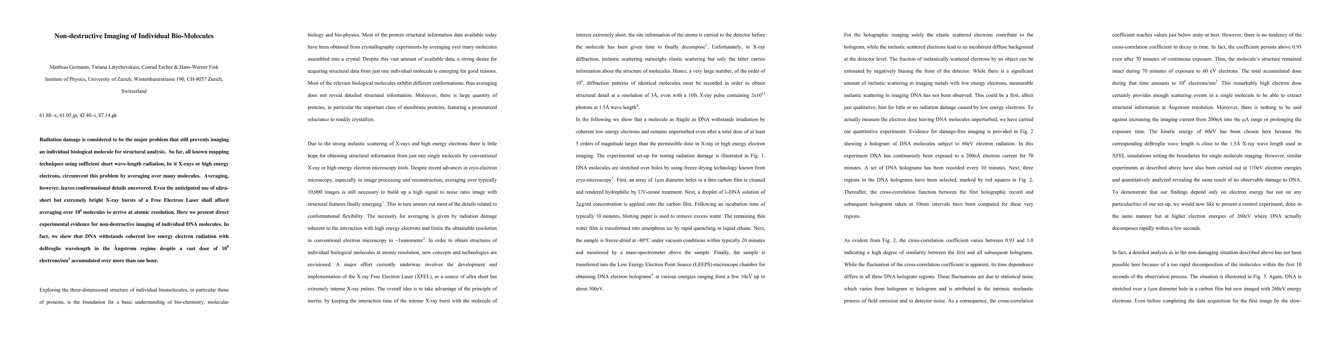 Radiation damage is considered to be the major problem that still prevents imaging an individual biological molecule for structural analysis. So far, all known mapping techniques using sufficient short wave-length radiation, be it X-rays or high energy electrons, circumvent this problem by averaging over many molecules. Averaging, however, leaves conformational details uncovered. Even the anticipated use of ultra-short but extremely bright X-ray bursts of a Free Electron Laser shall afford averaging over 10^6 molecules to arrive at atomic resolution. Here we present direct experimental evidence for non-destructive imaging of individual DNA molecules. In fact, we show that DNA withstands coherent low energy electron radiation with deBroglie wavelength in the Angstrom regime despite a vast dose of 10^8 electrons/nm^2 accumulated over more than one hour.