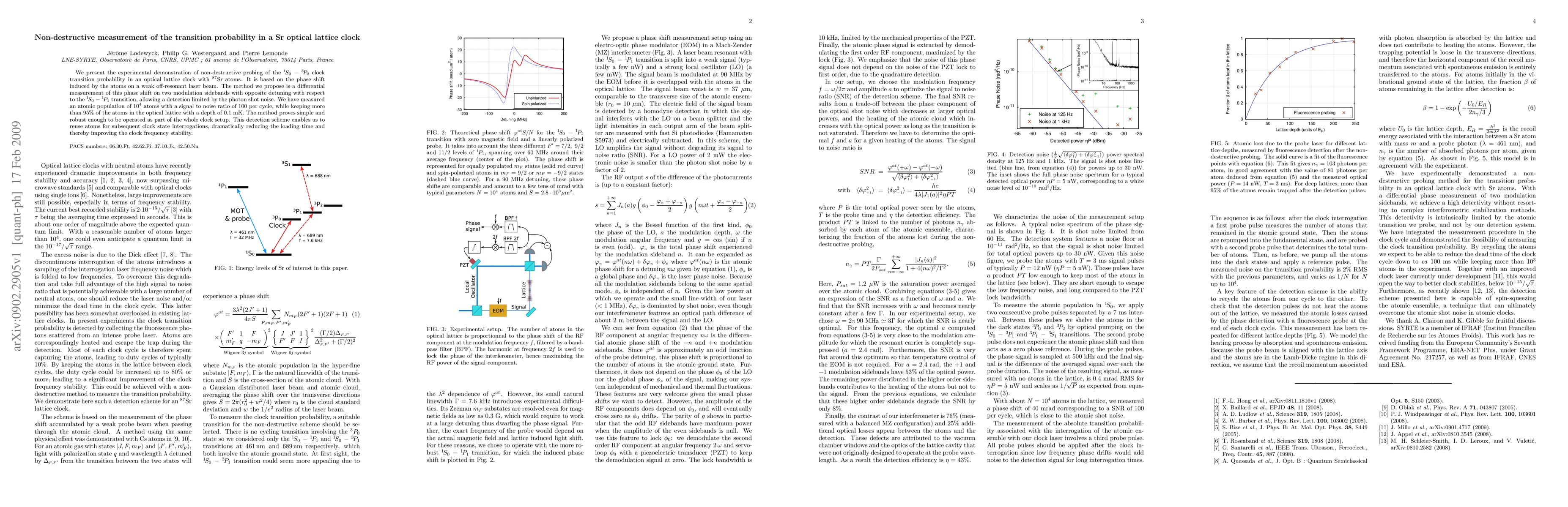 This paper demonstrates a non-destructive method for measuring the transition probability in a Sr optical lattice clock, using phase shift detection on modulation sidebands. The technique allows for high signal-to-noise ratio and efficient atom reuse, significantly enhancing clock stability.
