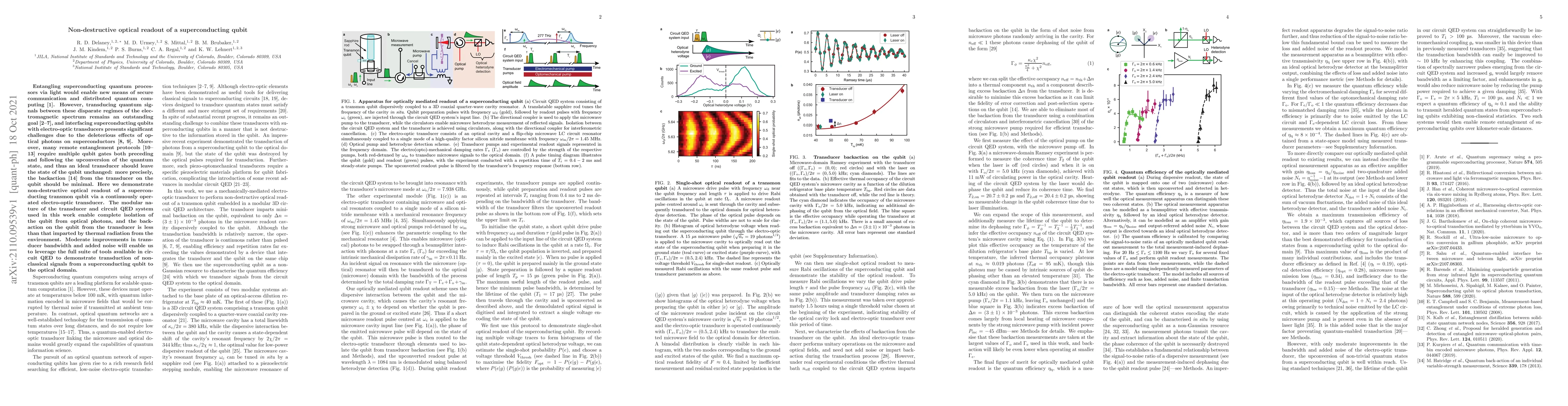 This paper demonstrates non-destructive optical readout of a superconducting qubit using a continuously operated electro-optic transducer, achieving minimal backaction and enabling potential secure communication and distributed quantum computing. Future improvements in transducer bandwidth and noise reduction are expected to fully leverage circuit QED tools for transduction of non-classical signals.