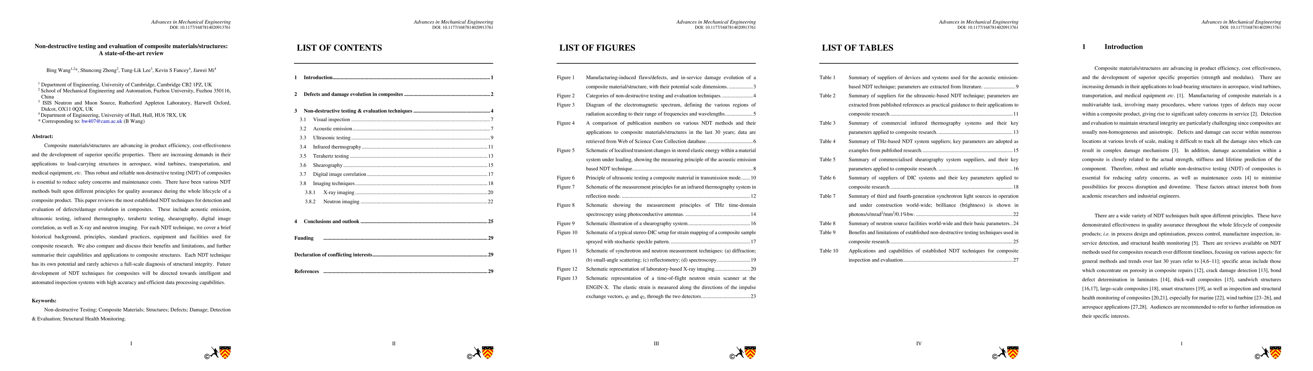 This paper reviews established non-destructive testing (NDT) techniques for evaluating composite materials, including acoustic emission, ultrasonic testing, and infrared thermography, among others. It discusses the benefits, limitations, and applications of each method, highlighting the need for advanced, intelligent inspection systems for future composite integrity assessments.