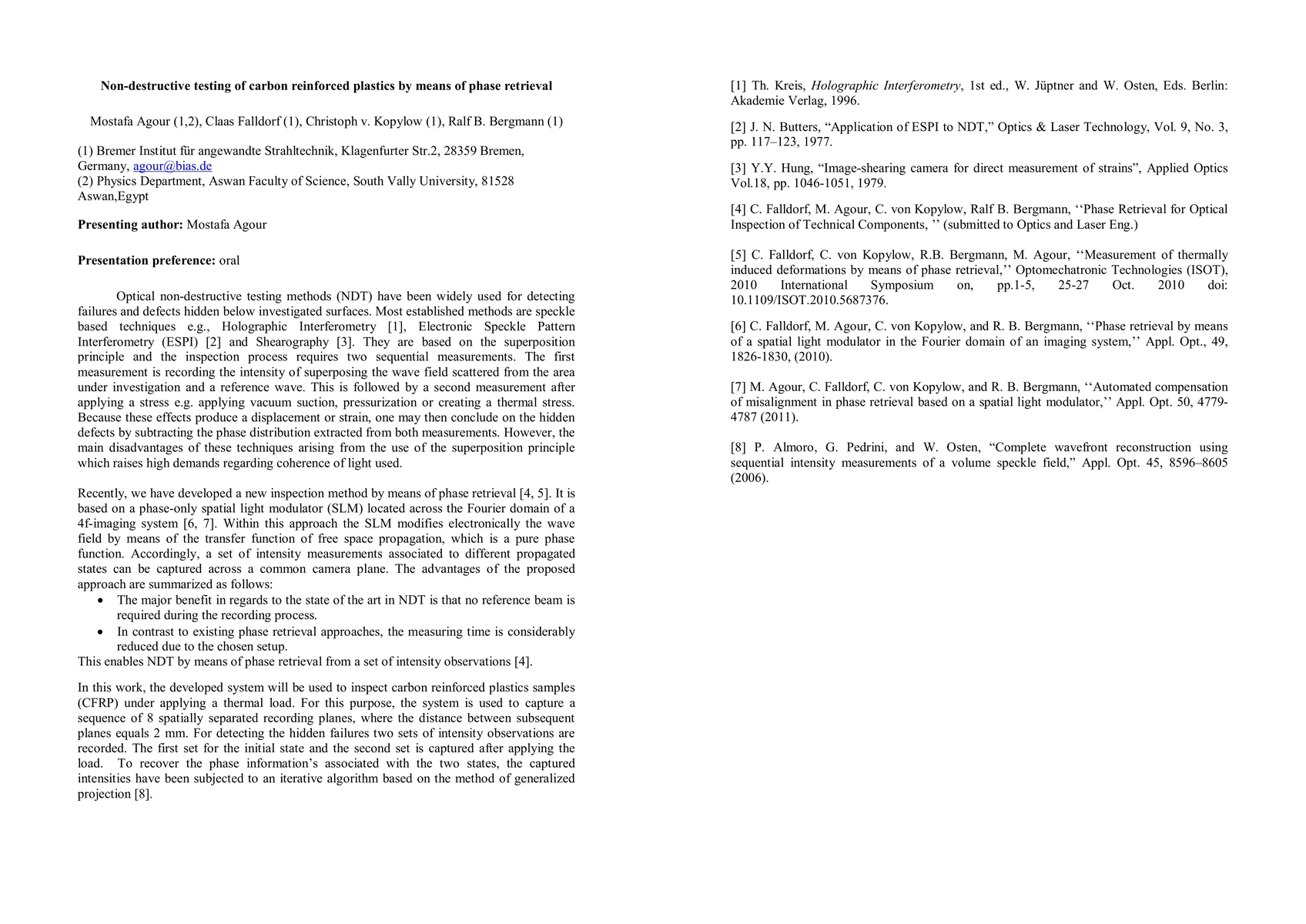 This research employs an SLM-based phase retrieval system to inspect carbon reinforced plastic (CFRP) samples under thermal load, capturing intensity data from 8 spatially separated planes. An iterative algorithm based on generalized projection is used to recover phase information, comparing initial and loaded states to detect hidden failures.