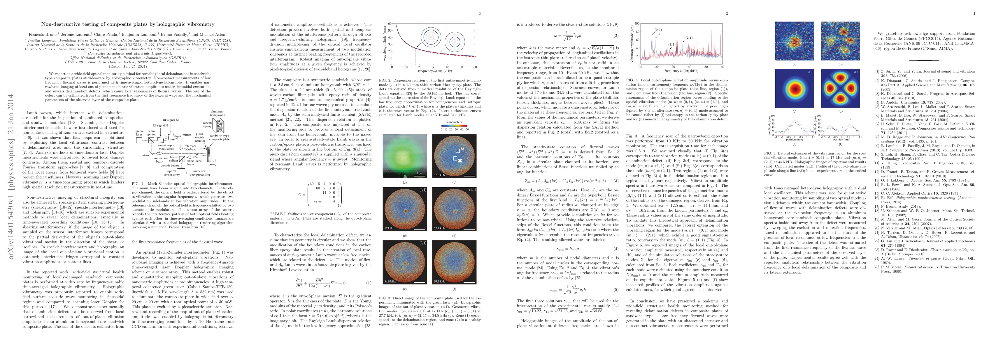 We report on a wide-field optical monitoring method for revealing local delaminations in sandwich-type composite plates at video-rate by holographic vibrometry. Non-contact measurements of low frequency flexural waves is performed with time-averaged heterodyne holography. It enables narrowband imaging of local out-of-plane nanometric vibration amplitudes under sinusoidal excitation, and reveals delamination defects, which cause local resonances of flexural waves. The size of the defect can be estimated from the first resonance frequency of the flexural wave and the mechanical parameters of the observed layer of the composite plate.