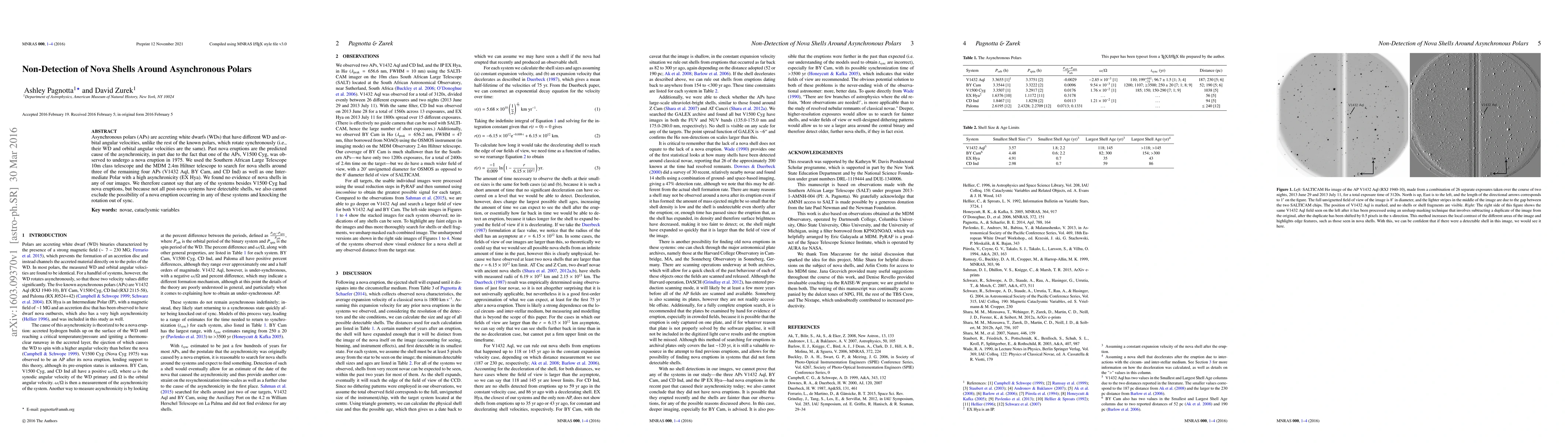 This study used telescopes to search for nova shells around three asynchronous polars and one intermediate polar, but found no evidence of such shells, indicating no recent nova eruptions could be confirmed. The absence of detectable shells does not rule out past nova events, as not all post-nova systems exhibit detectable remnants.