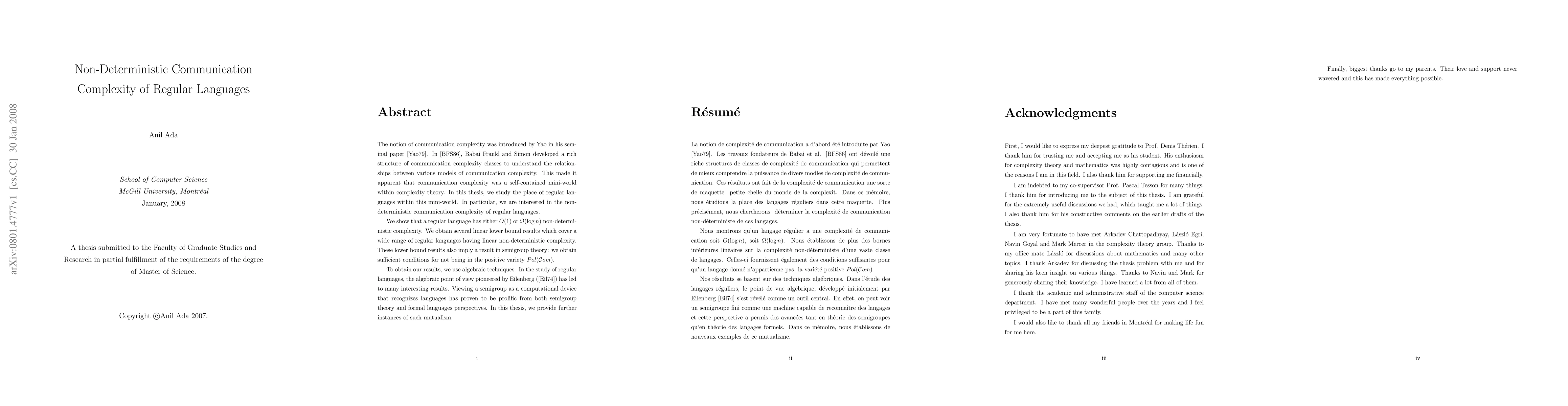 This paper investigates the non-deterministic communication complexity of regular languages, demonstrating that such languages have either constant or logarithmic complexity. The study employs algebraic techniques to derive linear lower bounds for a wide range of regular languages, contributing to both semigroup theory and the formal languages field.