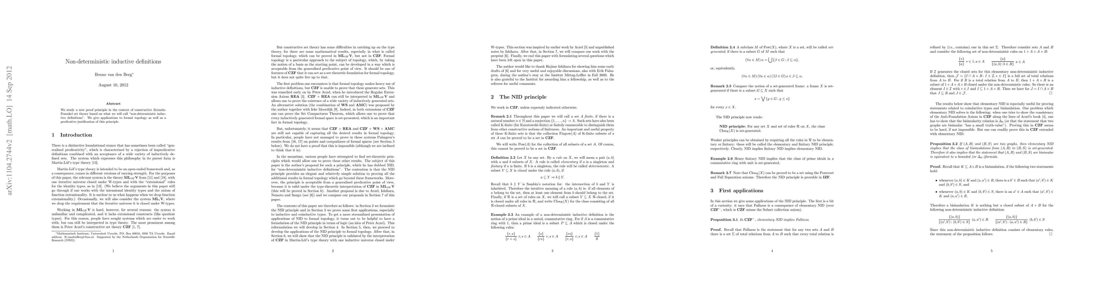 We study a new proof principle in the context of constructive Zermelo-Fraenkel set theory based on what we will call "non-deterministic inductive definitions". We give applications to formal topology as well as a predicative justification of this principle.