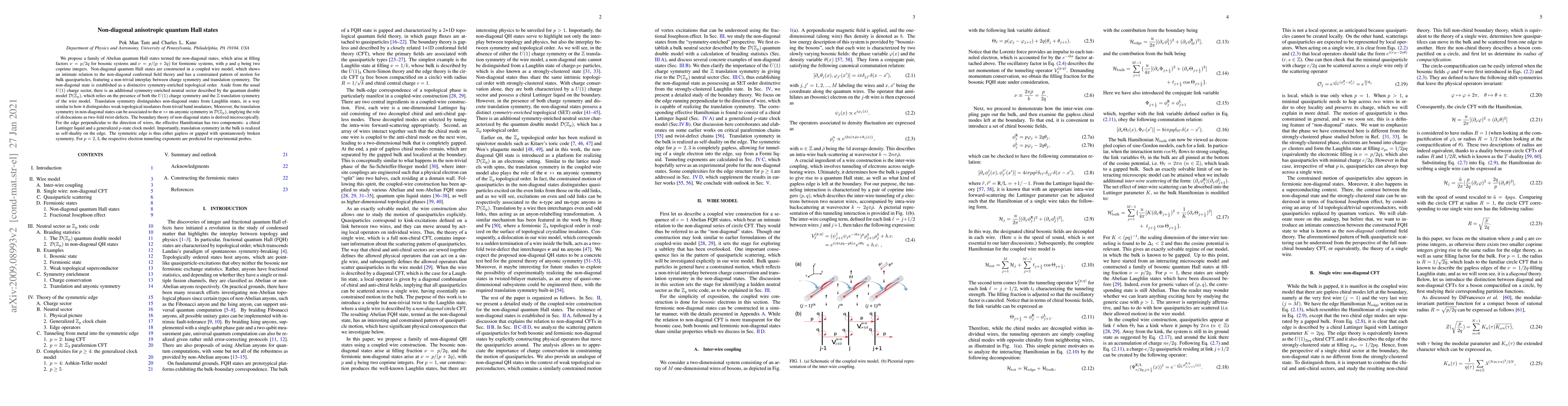 The paper introduces non-diagonal quantum Hall states, distinct from Laughlin states, arising at specific filling factors for bosonic and fermionic systems. These states, constructed via a coupled wire model, feature a unique interplay of charge and translation symmetries, with an additional neutral sector described by the quantum double model D(Z_p). The translation symmetry in bulk is reflected as self-duality on the edge, influencing the edge's gapless or gapped nature. The paper predicts electron tunneling exponents for p=2,3 for experimental verification.