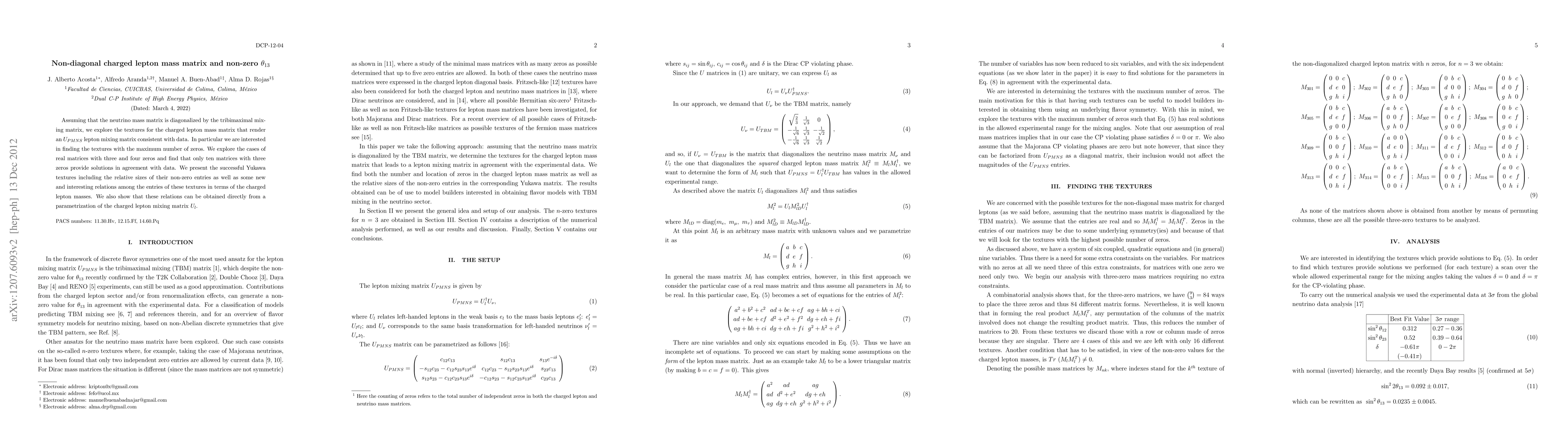 Assuming that the neutrino mass matrix is diagonalized by the tribimaximal mixing matrix, we explore the textures for the charged lepton mass matrix that render an $U_{PMNS}$ lepton mixing matrix consistent with data. In particular we are interested in finding the textures with the maximum number of zeros. We explore the cases of real matrices with three and four zeros and find that only ten matrices with three zeros provide solutions in agreement with data. We present the successful Yukawa textures including the relative sizes of their non-zero entries as well as some new and interesting relations among the entries of these textures in terms of the charged lepton masses. We also show that these relations can be obtained directly from a parametrization of the charged lepton mixing matrix $U_l$.