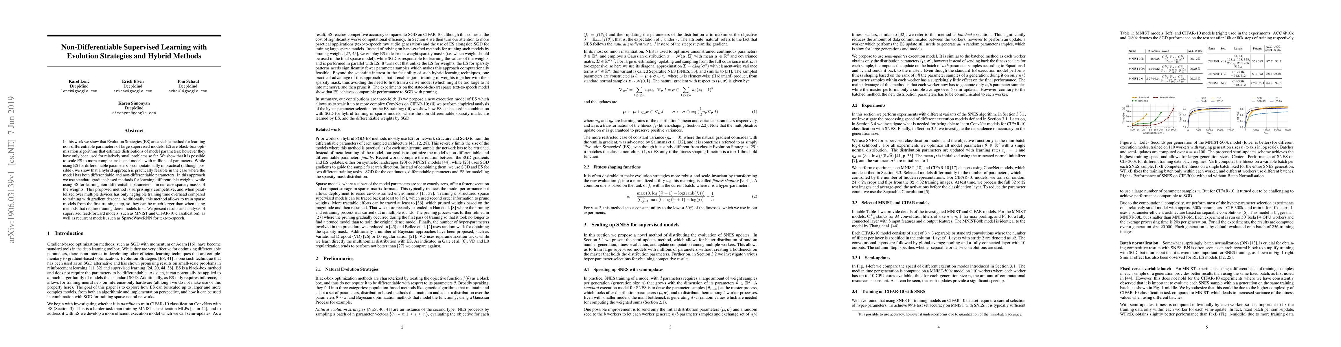 In this work we show that Evolution Strategies (ES) are a viable method for learning non-differentiable parameters of large supervised models. ES are black-box optimization algorithms that estimate distributions of model parameters; however they have only been used for relatively small problems so far. We show that it is possible to scale ES to more complex tasks and models with millions of parameters. While using ES for differentiable parameters is computationally impractical (although possible), we show that a hybrid approach is practically feasible in the case where the model has both differentiable and non-differentiable parameters. In this approach we use standard gradient-based methods for learning differentiable weights, while using ES for learning non-differentiable parameters - in our case sparsity masks of the weights. This proposed method is surprisingly competitive, and when parallelized over multiple devices has only negligible training time overhead compared to training with gradient descent. Additionally, this method allows to train sparse models from the first training step, so they can be much larger than when using methods that require training dense models first. We present results and analysis of supervised feed-forward models (such as MNIST and CIFAR-10 classification), as well as recurrent models, such as SparseWaveRNN for text-to-speech.