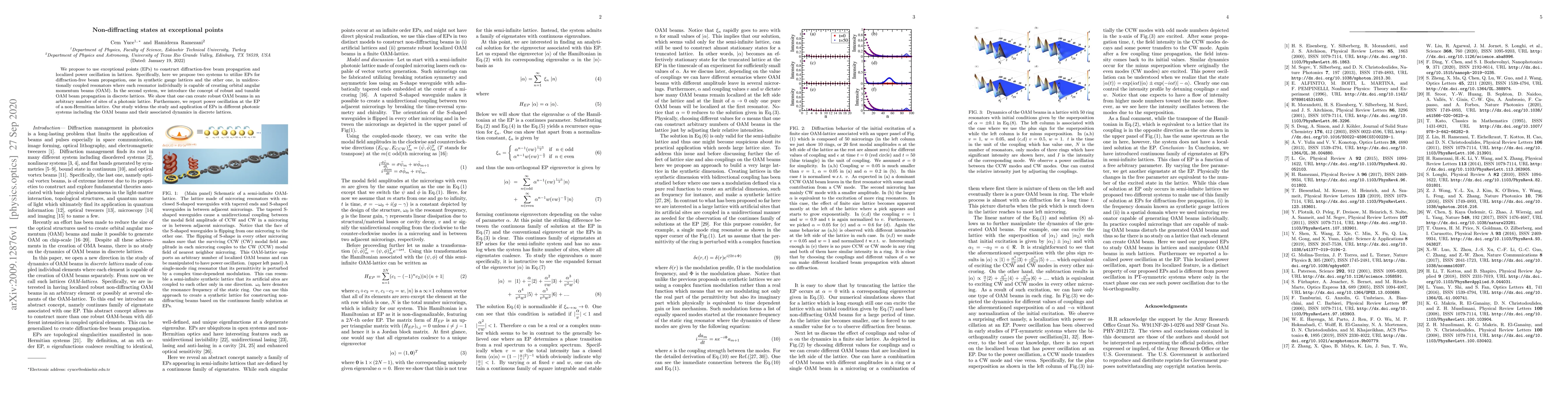 We propose to use exceptional points (EPs) to construct diffraction-free beam propagation and localized power oscillation in lattices. Specifically, here we propose two systems to utilize EPs for diffraction-free beam propagation, one in synthetic gauge lattices and the other one, in unidirectionally coupled resonators where each resonator individually is capable of creating orbital angular momentum beams (OAM). In the second system, we introduce the concept of robust and tunable OAM beam propagation in discrete lattices. We show that one can create robust OAM beams in an arbitrary number of sites of a photonic lattice. Furthermore, we report power oscillation at the EP of a non-Hermitian lattice. Our study widens the study and application of EPs in different photonic systems including the OAM beams and their associated dynamics in discrete lattices.