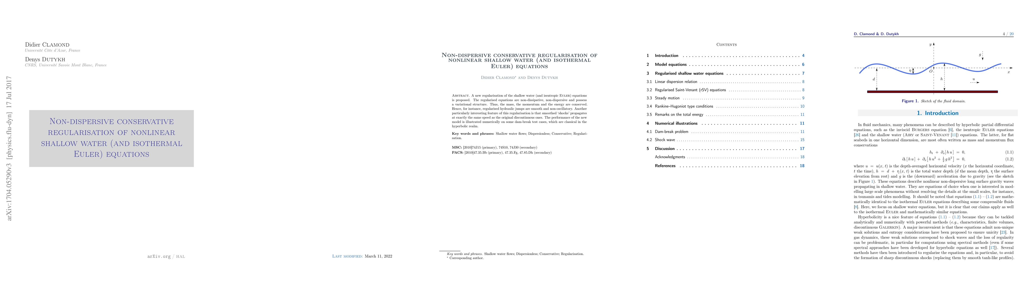 This paper proposes a new non-dispersive, conservative regularisation of nonlinear shallow water and isothermal Euler equations, ensuring conservation of mass, momentum, and energy, and demonstrating smooth, non-oscillatory hydraulic jumps and shock propagation at the same speed as discontinuous shocks, validated through dam-break test cases.