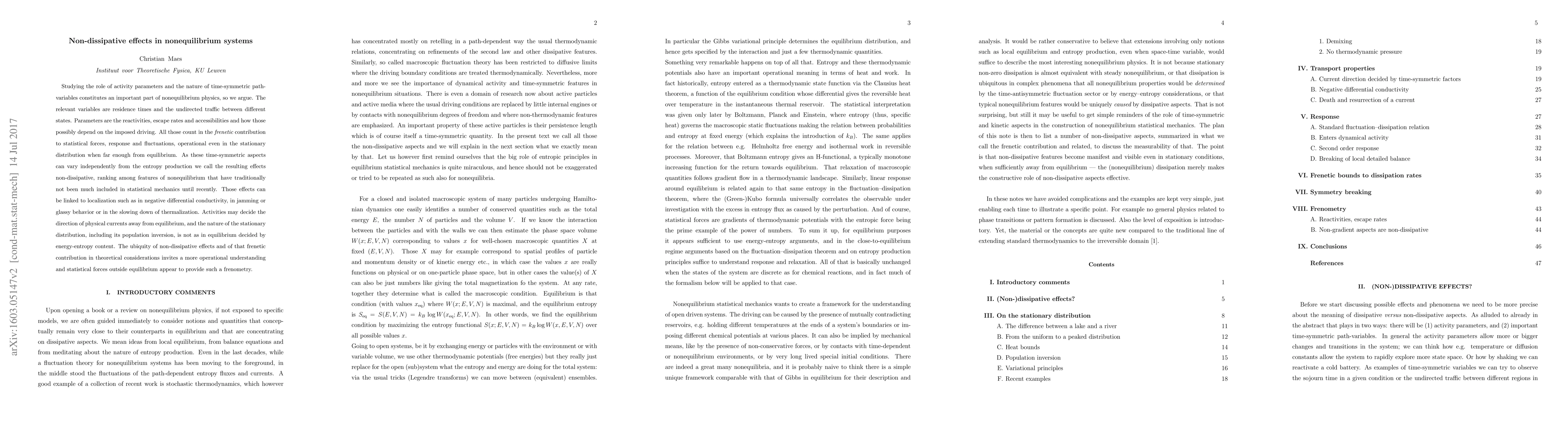 Studying the role of activity parameters and the nature of time-symmetric path-variables constitutes an important part of nonequilibrium physics, so we argue. The relevant variables are residence times and the undirected traffic between different states. Parameters are the reactivities, escape rates and accessibilities and how those possibly depend on the imposed driving. All those count in the frenetic contribution to statistical forces, response and fluctuations, operational even in the stationary distribution when far enough from equilibrium. As these time-symmetric aspects can vary independently from the entropy production we call the resulting effects non-dissipative, ranking among features of nonequilibrium that have traditionally not been much included in statistical mechanics until recently. Those effects can be linked to localization such as in negative differential conductivity, in jamming or glassy behavior or in the slowing down of thermalization. Activities may decide the direction of physical currents away from equilibrium, and the nature of the stationary distribution, including its population inversion, is not as in equilibrium decided by energy-entropy content. The ubiquity of non-dissipative effects and of that frenetic contribution in theoretical considerations invites a more operational understanding and statistical forces outside equilibrium appear to provide such a frenometry.