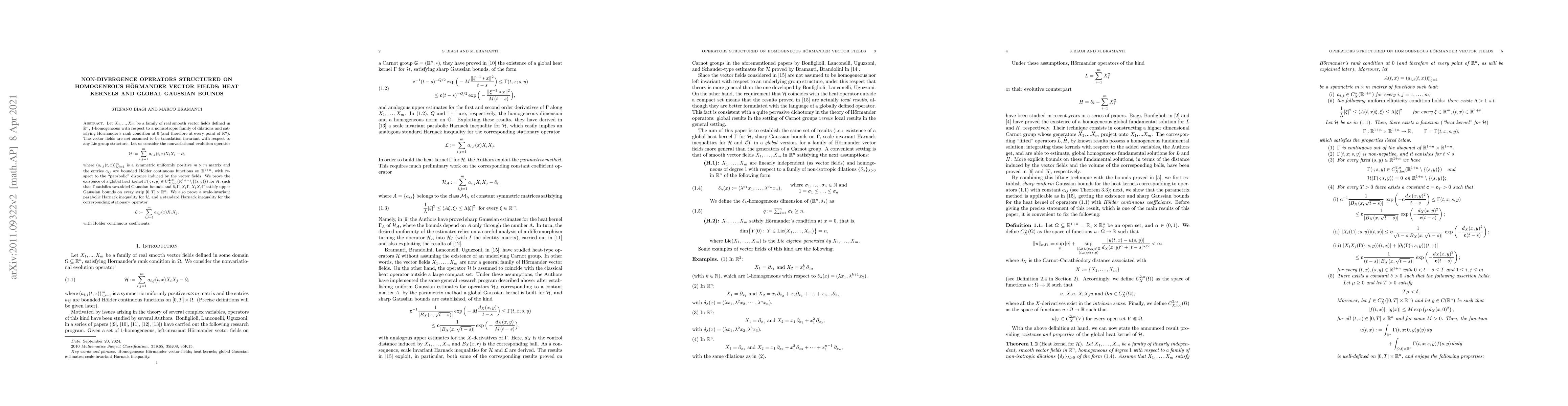 This paper explores non-divergence operators based on homogeneous Hörmander vector fields, proving the existence of a global heat kernel with Gaussian bounds for the operator. It also establishes a scale-invariant parabolic Harnack inequality and a standard Harnack inequality for the stationary version of the operator.