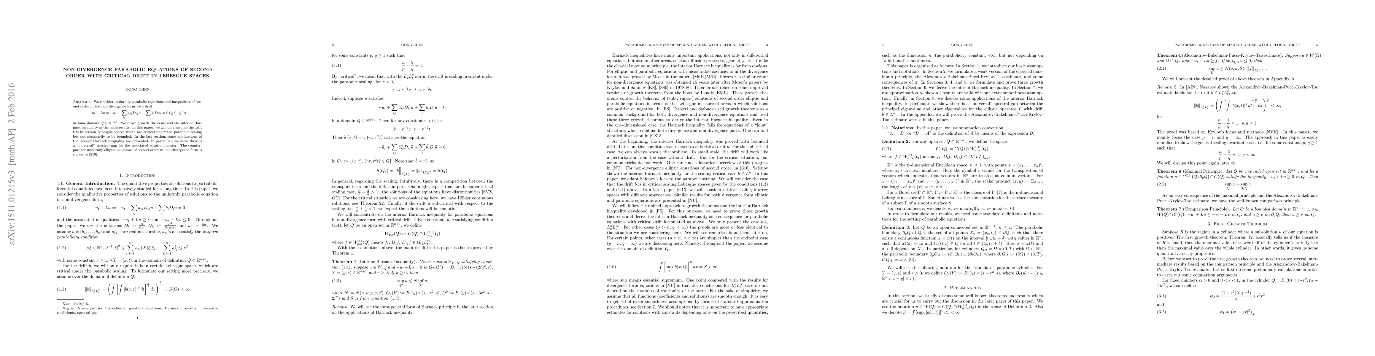 This paper studies uniformly parabolic second-order equations in non-divergence form with critical drift in Lebesgue spaces, proving growth theorems and the interior Harnack inequality. It also demonstrates a "universal" spectral gap for the associated elliptic operator, extending results from uniformly elliptic equations.