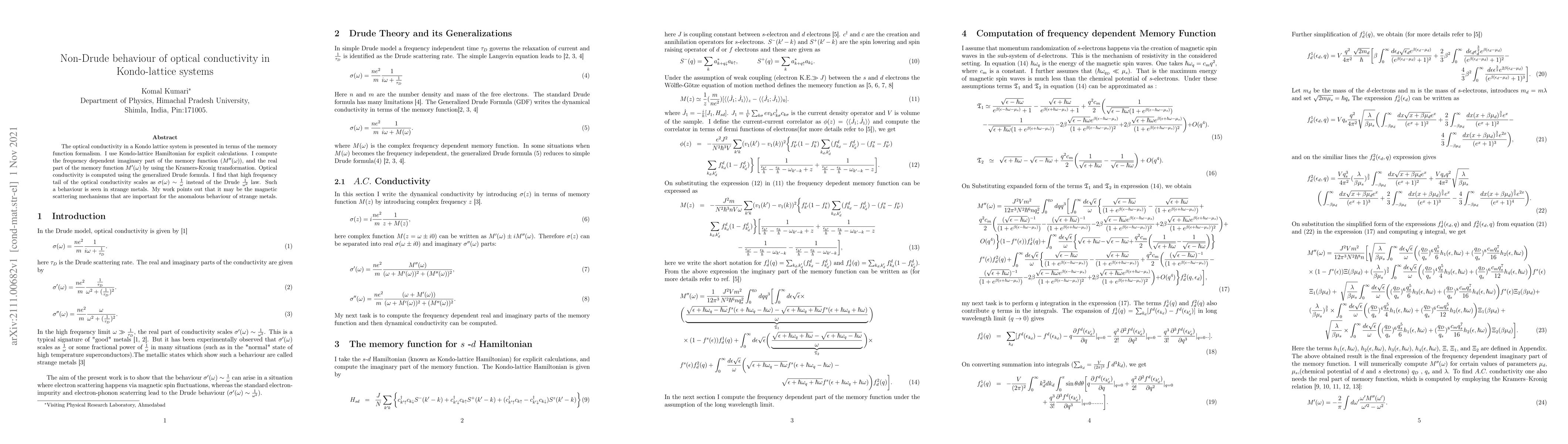 This paper investigates the optical conductivity in Kondo-lattice systems using memory function formalism, finding that high-frequency optical conductivity follows a $\sigma(\omega) \sim \frac{1}{\omega}$ scaling instead of the conventional Drude $\frac{1}{\omega^2}$ law, suggesting magnetic scattering mechanisms contribute to the anomalous behavior seen in strange metals.