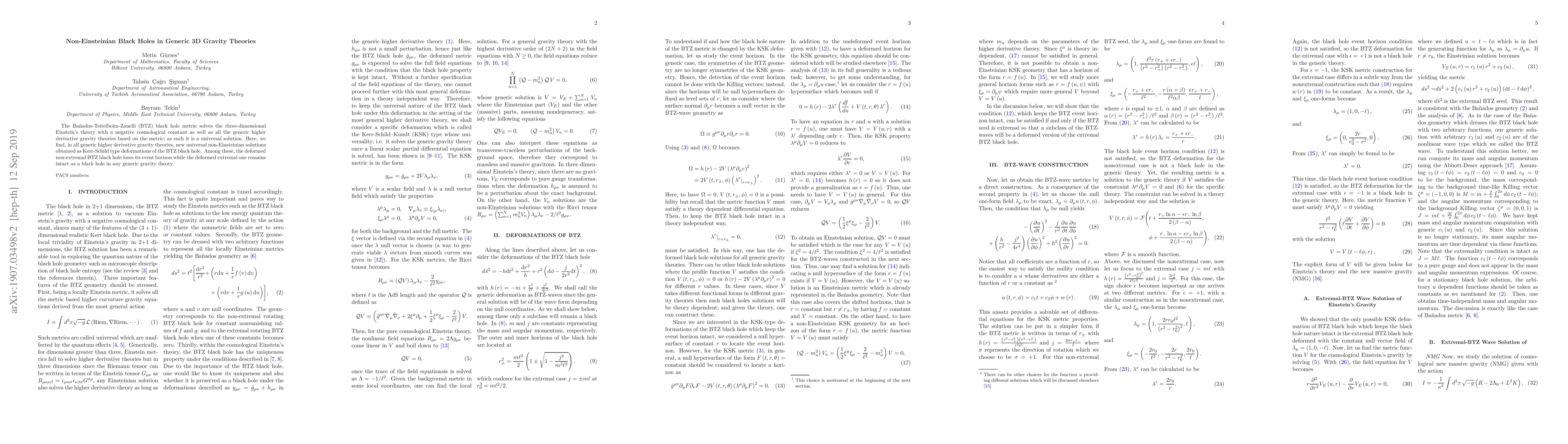 This paper identifies new universal non-Einsteinian black hole solutions in generic 3D gravity theories, derived as Kerr-Schild deformations of the BTZ black hole. The study finds that while the deformed non-extremal BTZ black hole loses its event horizon, the deformed extremal one retains its black hole characteristics.