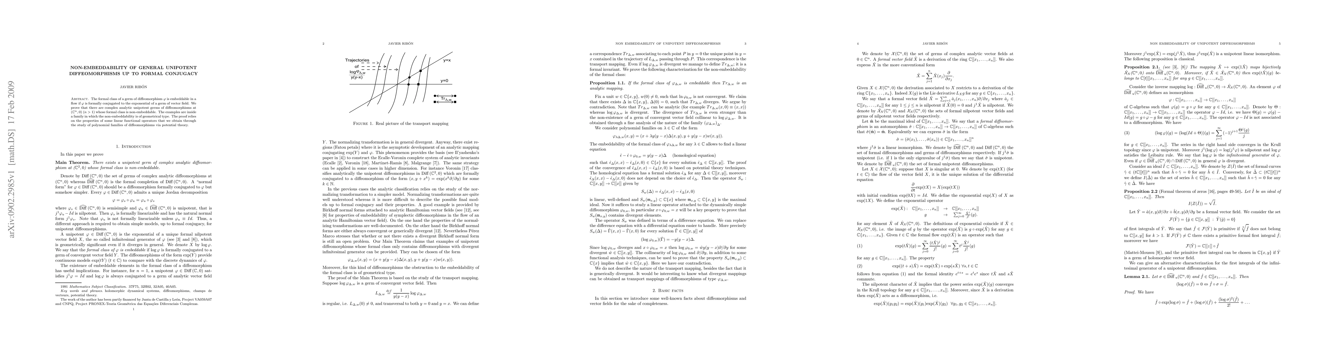 The formal class of a germ of diffeomorphism $\phi$ is embeddable in a flow if $\phi$ is formally conjugated to the exponential of a germ of vector field. We prove that there are complex analytic unipotent germs of diffeomorphisms at $({\mathbb C}^{n},0)$ ($n>1$) whose formal class is non-embeddable. The examples are inside a family in which the non-embeddability is of geometrical type. The proof relies on the properties of some linear functional operators that we obtain through the study of polynomial families of diffeomorphisms via potential theory.
