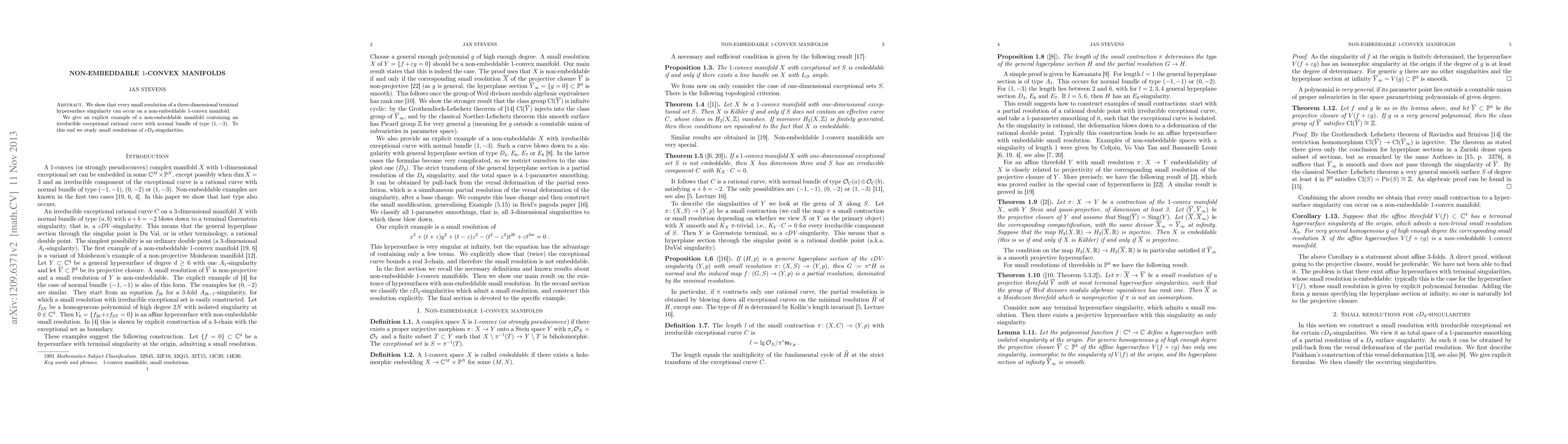 We show that every small resolution of a three-dimensional terminal hypersurface singularity can occur on a non-embeddable 1-convex manifold. We give an explicit example of a non-embeddable manifold containing an irreducible exceptional rational curve with normal bundle of type (1,-3). To this end we study small resolutions of cD_4-singularities.
