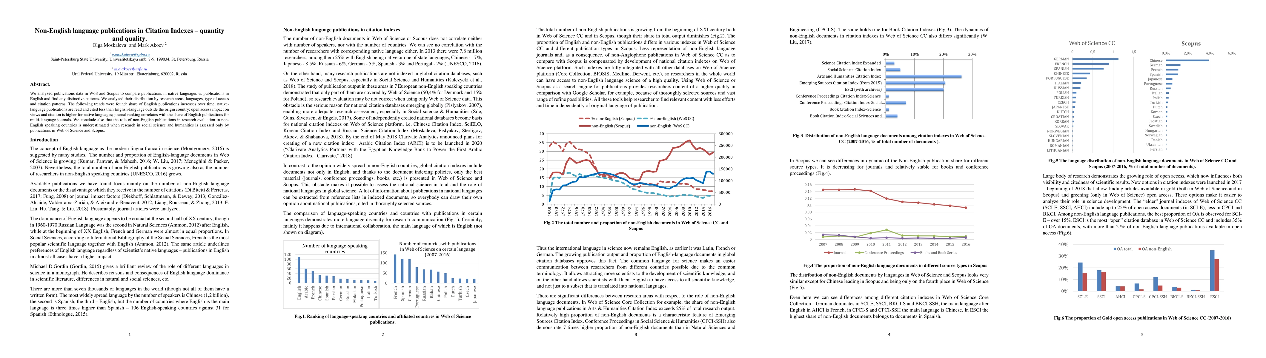 We analyzed publications data in WoS and Scopus to compare publications in native languages vs publications in English and find any distinctive patterns. We analyzed their distribution by research areas, languages, type of access and citation patterns. The following trends were found: share of English publications increases over time; native-language publications are read and cited less than English-language outside the origin country; open access impact on views and citation is higher for native languages; journal ranking correlates with the share of English publications for multi-language journals. We conclude also that the role of non-English publications in research evaluation in non-English speaking countries is underestimated when research in social science and humanities is assessed only by publications in Web of Science and Scopus.