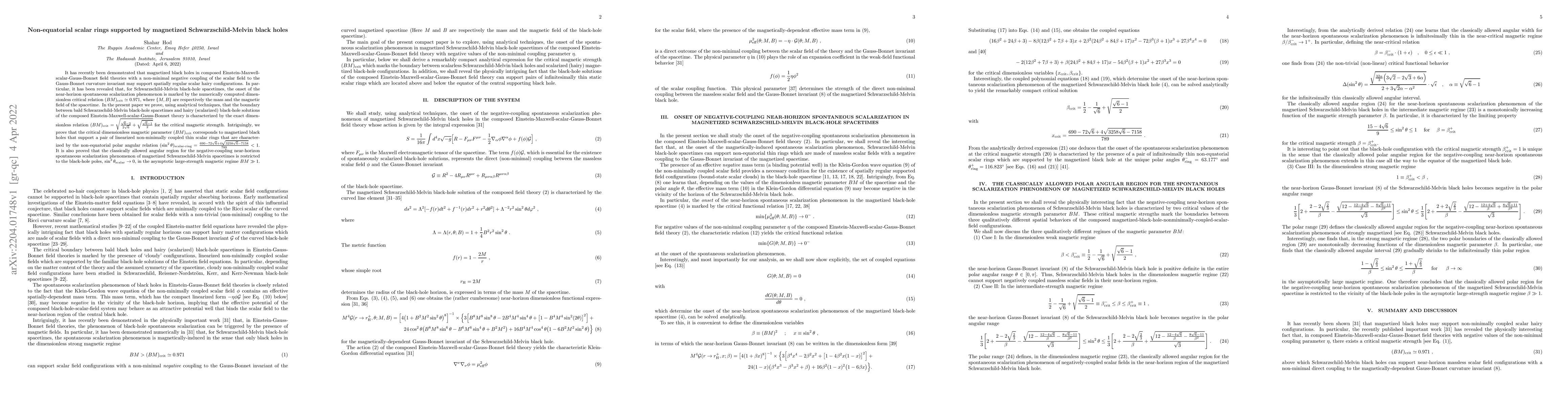 It has recently been demonstrated that magnetized black holes in composed Einstein-Maxwell-scalar-Gauss-Bonnet field theories with a non-minimal negative coupling of the scalar field to the Gauss-Bonnet curvature invariant may support spatially regular scalar hairy configurations. In particular, it has been revealed that, for Schwarzschild-Melvin black-hole spacetimes, the onset of the near-horizon spontaneous scalarization phenomenon is marked by the numerically computed dimensionless critical relation $(BM)_{\text{crit}}\simeq0.971$, where $\{M,B\}$ are respectively the mass and the magnetic field of the spacetime. In the present paper we prove, using analytical techniques, that the boundary between bald Schwarzschild-Melvin black-hole spacetimes and hairy (scalarized) black-hole solutions of the composed Einstein-Maxwell-scalar-Gauss-Bonnet theory is characterized by the exact dimensionless relation $(BM)_{\text{crit}}=\sqrt{{{\sqrt{6}-2}\over{2\sqrt{6}}}+\sqrt{{{\sqrt{6}-1}\over{2}}}}$ for the critical magnetic strength. Intriguingly, we prove that the critical dimensionless magnetic parameter $(BM)_{\text{crit}}$ corresponds to magnetized black holes that support a pair of linearized non-minimally coupled thin scalar rings that are characterized by the non-equatorial polar angular relation $(\sin^2\theta)_{\text{scalar-ring}}={{690-72\sqrt{6}+4\sqrt{3258\sqrt{6}-7158}}\over{789}}<1$. It is also proved that the classically allowed angular region for the negative-coupling near-horizon spontaneous scalarization phenomenon of magnetized Schwarzschild-Melvin spacetimes is restricted to the black-hole poles, $\sin^2\theta_{\text{scalar}}\to0$, in the asymptotic large-strength magnetic regime $BM\gg1$.