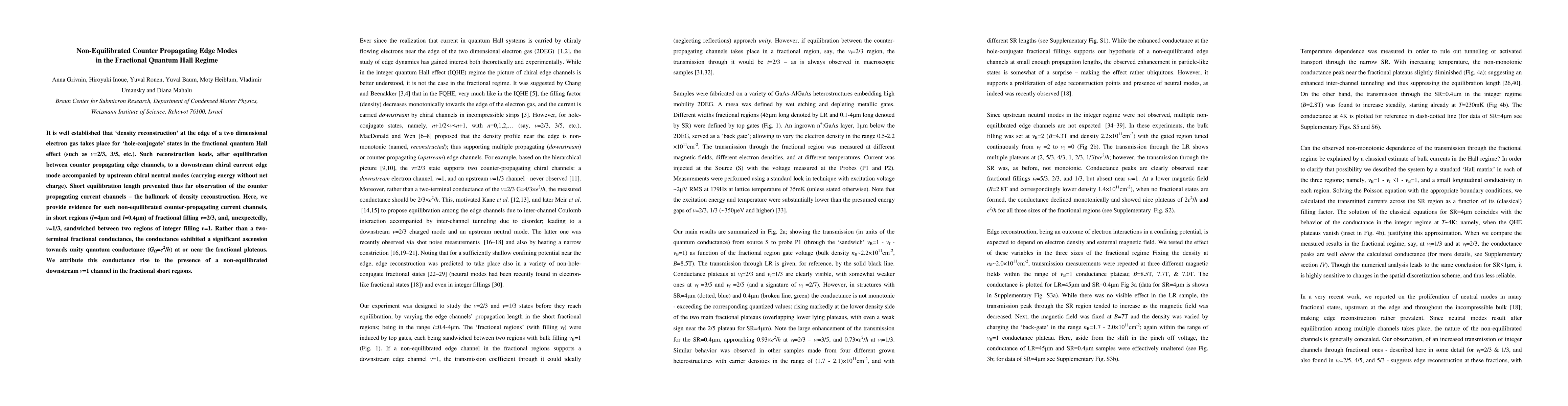 It is well established that 'density reconstruction' at the edge of a two dimensional electron gas takes place for 'hole-conjugate' states in the fractional quantum Hall effect (such as ${\nu}=2/3, 3/5,$ etc.). Such reconstruction leads, after equilibration between counter propagating edge channels, to a downstream chiral current edge mode accompanied by upstream chiral neutral modes (carrying energy without net charge). Short equilibration length prevented thus far observation of the counter propagating current channels - the hallmark of density reconstruction. Here, we provide evidence for such non-equilibrated counter-propagating current channels, in short regions $(l=4{\mu}m$ and $l=0.4{\mu}m)$ of fractional filling ${\nu}=2/3$, and, unexpectedly, ${\nu}=1/3$, sandwiched between two regions of integer filling ${\nu}=1$. Rather than a two-terminal fractional conductance, the conductance exhibited a significant ascension towards unity quantum conductance $(G_Q=e^2/h)$ at or near the fractional plateaus. We attribute this conductance rise to the presence of a non-equilibrated downstream ${\nu}=1$ channel in the fractional short regions.