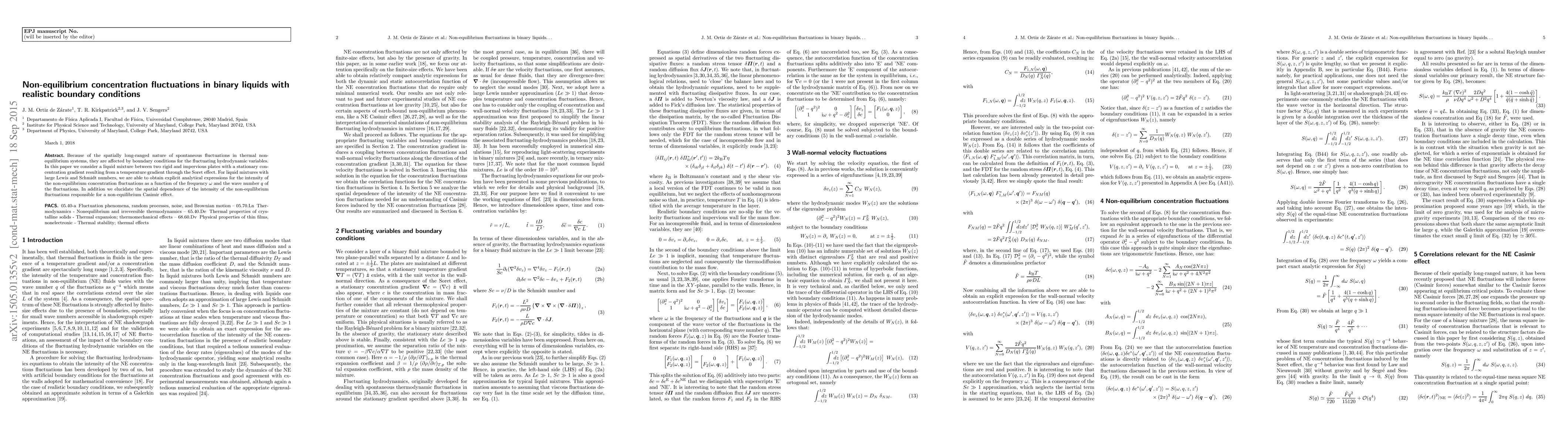 This paper investigates non-equilibrium concentration fluctuations in binary liquid mixtures under realistic boundary conditions, specifically between two rigid plates with a temperature gradient causing a Soret effect. It derives analytical expressions for the fluctuation intensity as a function of frequency and wave number, and explores the spatial dependence of these fluctuations, including their role in a non-equilibrium Casimir effect.