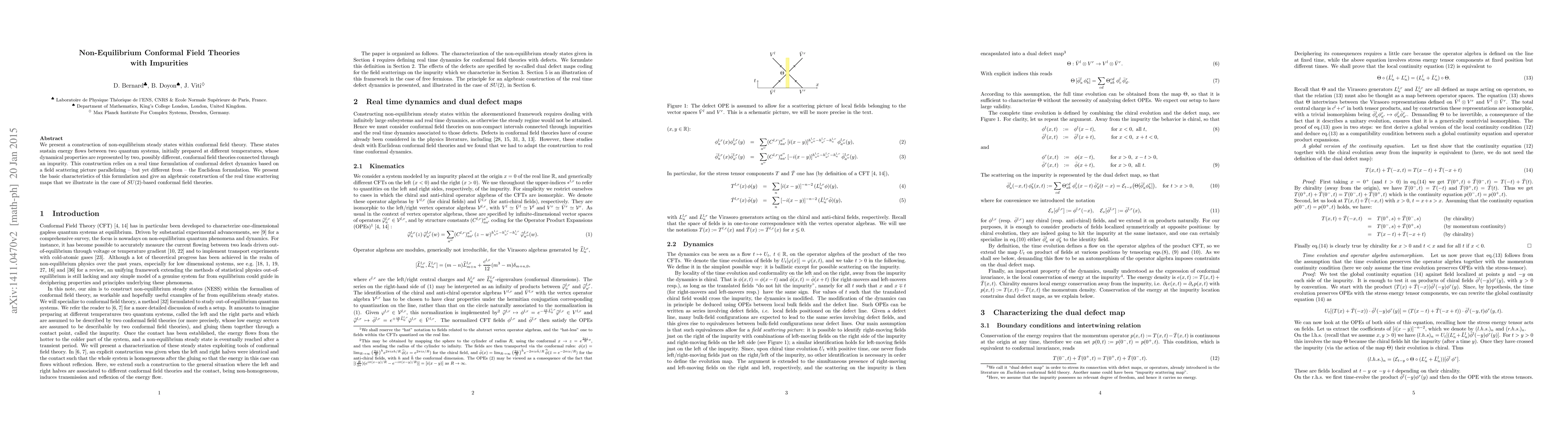 This paper constructs non-equilibrium steady states in conformal field theory using an impurity to connect two quantum systems at different temperatures. It introduces a real-time formulation of conformal defect dynamics and provides an algebraic construction of real-time scattering maps, illustrated with SU(2)-based conformal field theories.